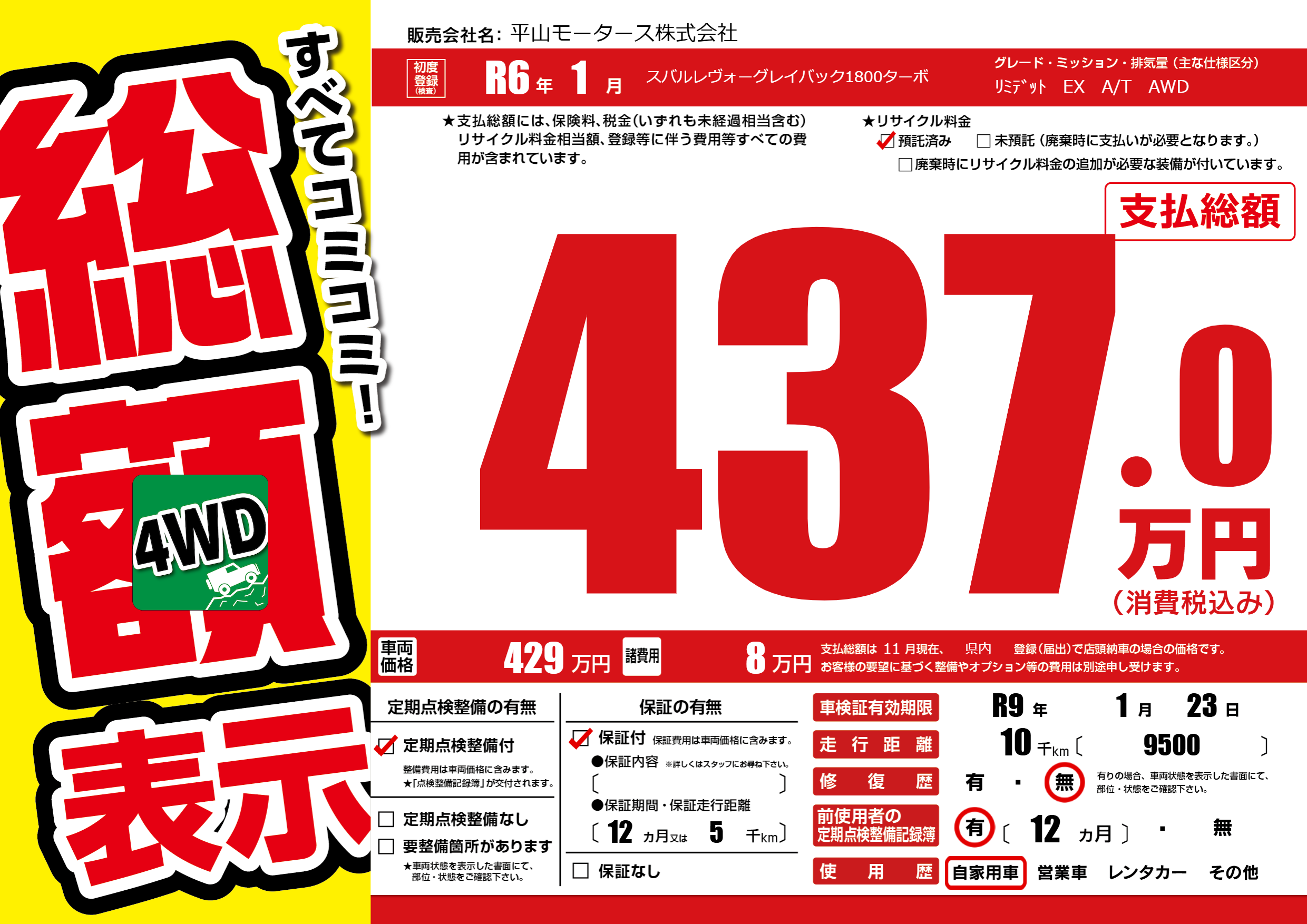 | 車名 | スバルレヴォーグレイバック1800ターボ | グレード ミッション 排気量 |