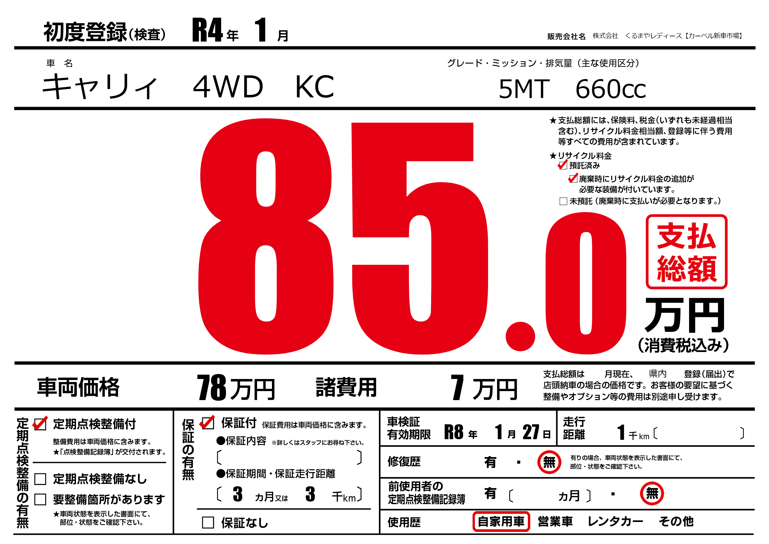 | 車名 | キャリィ 4WD KC | グレード ミッション 排気量 |