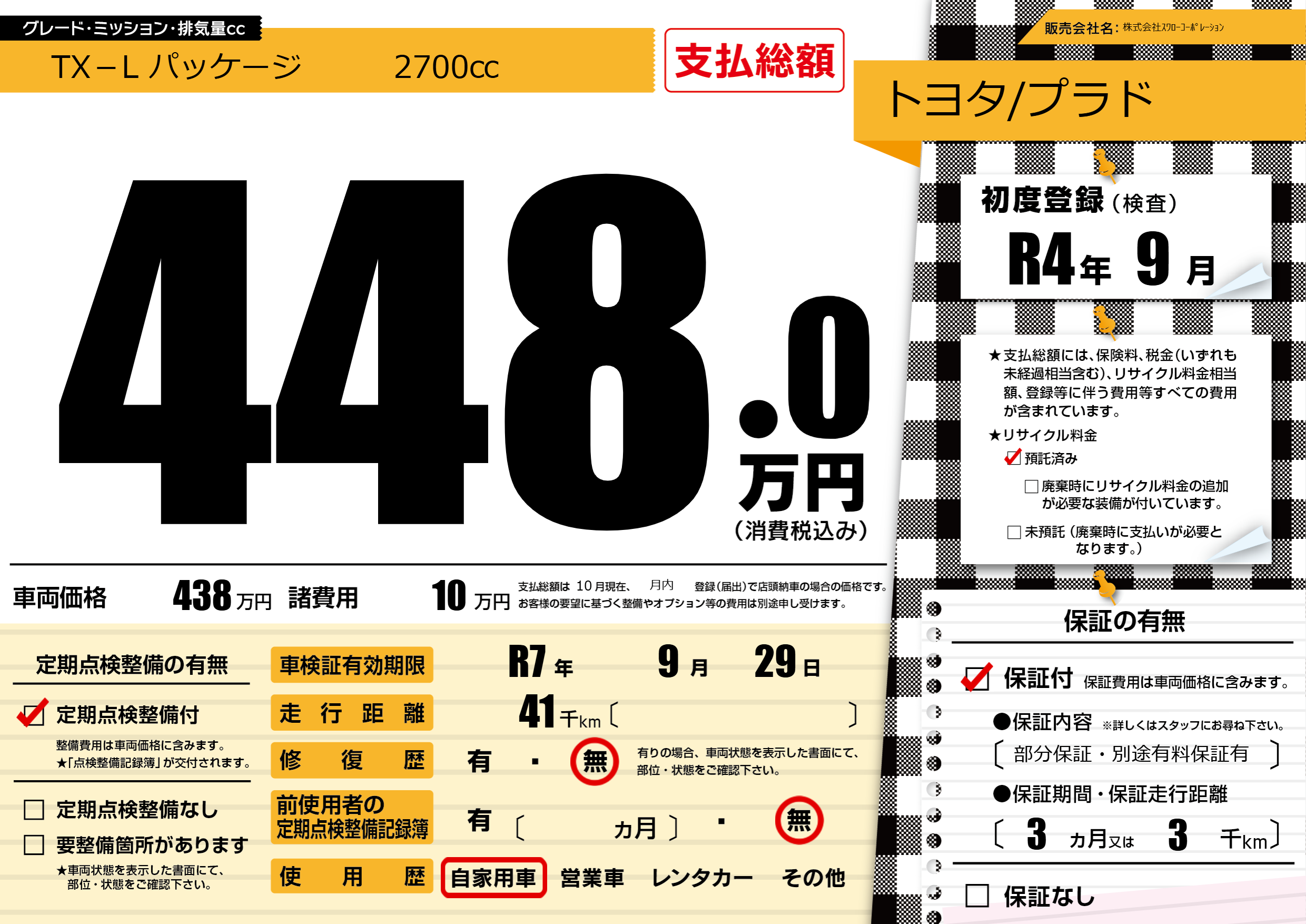 | 車名 | トヨタ/プラド | グレード ミッション 排気量 |
