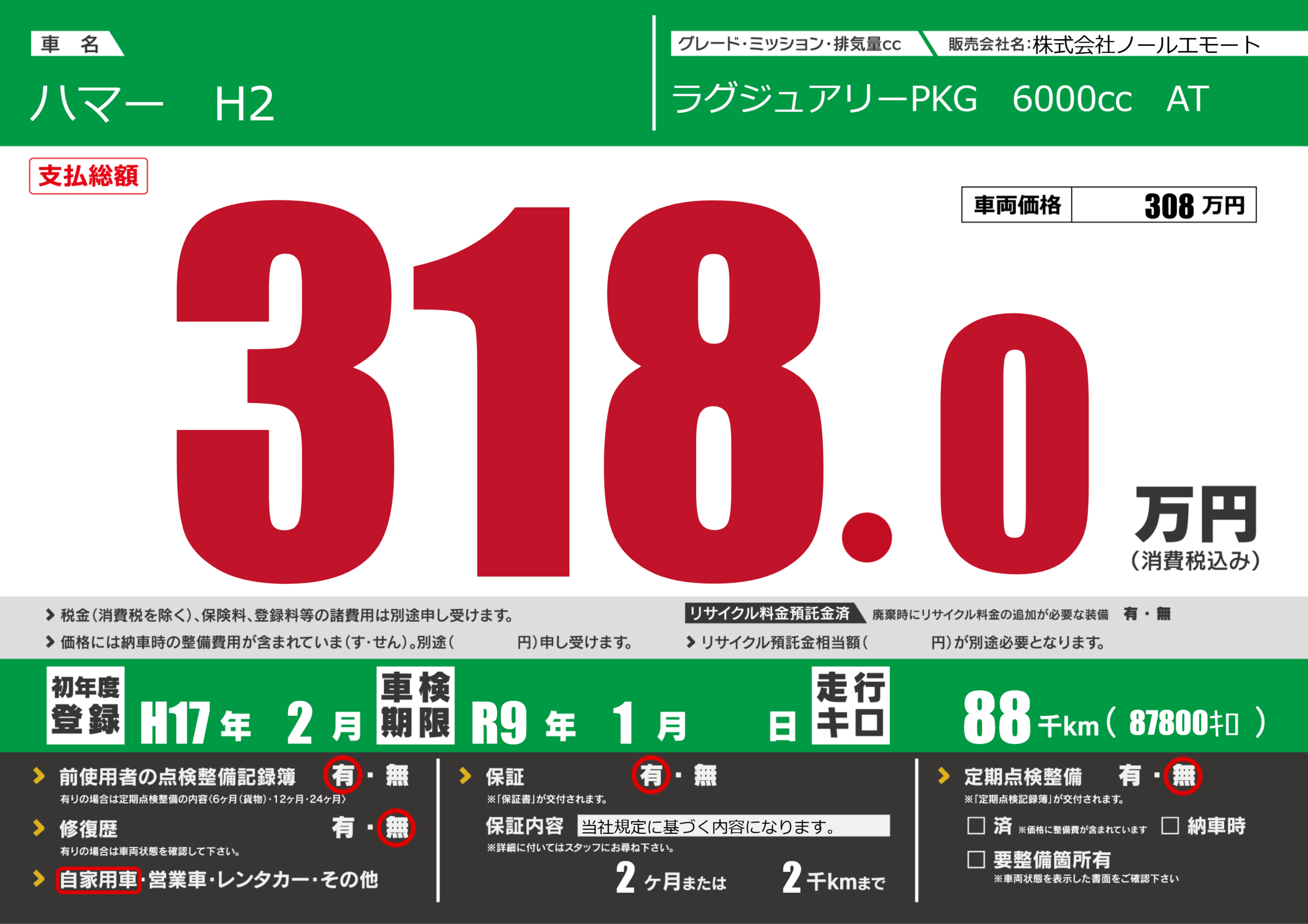 | 車名 | ハマー H2 | グレード ミッション 排気量 |