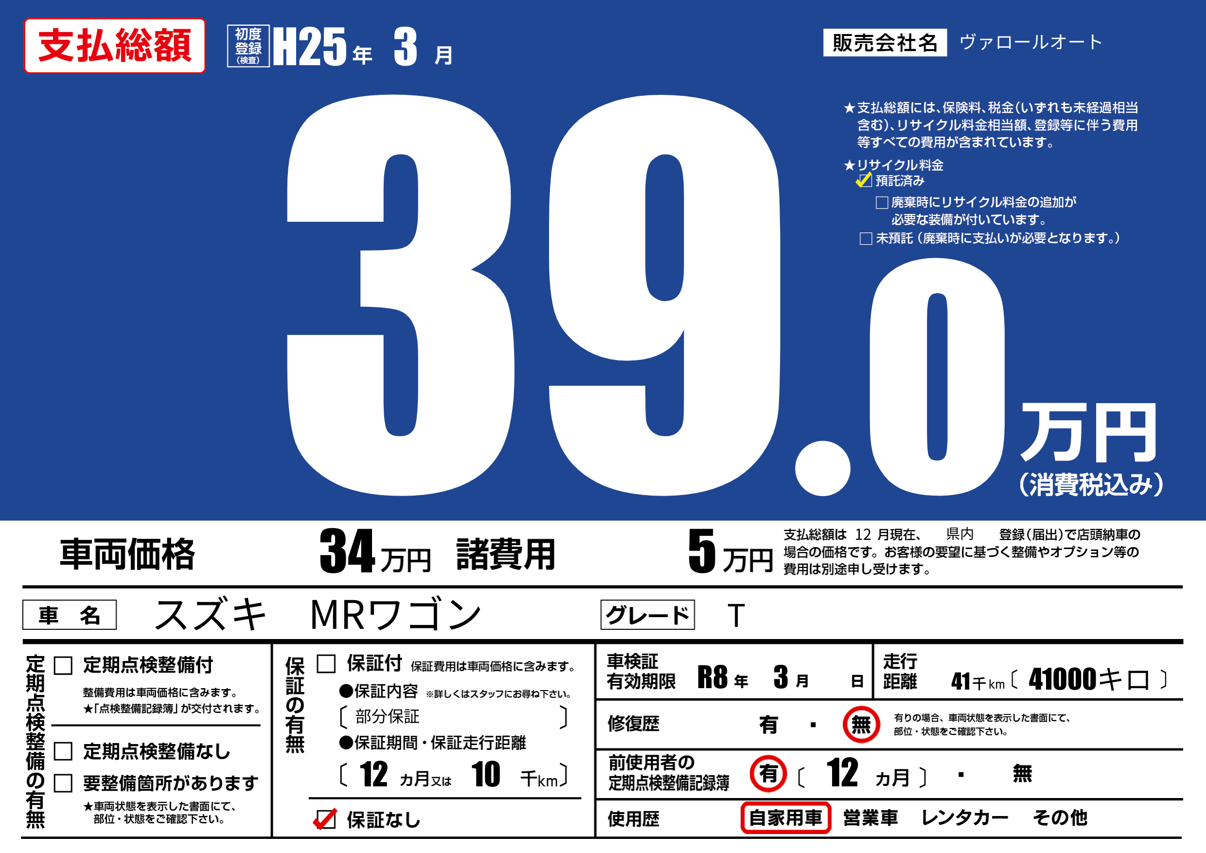 | 走行キロ | 4.1万km | 初年度登録 | H25年3月 |