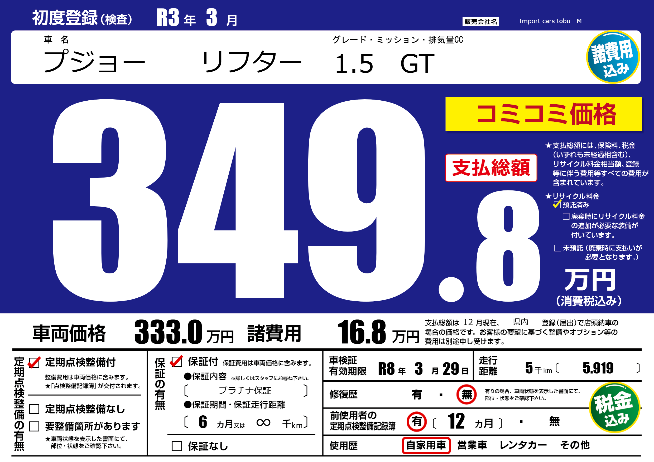 保証付き 保証内容( プラチナ保証) 6ヶ月または(∞)千kmまで |