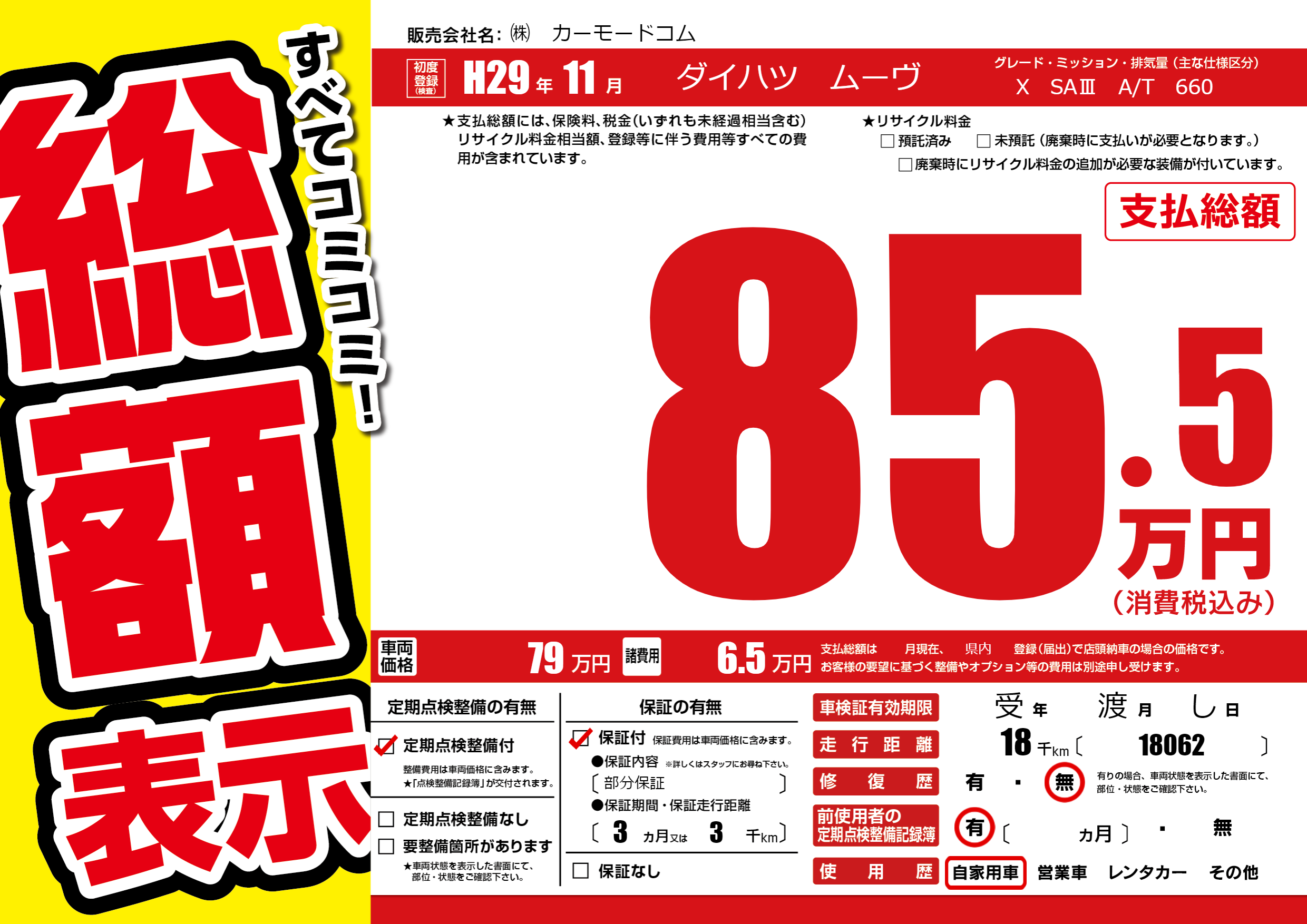 保証付き 保証内容(部分保証) 3ヶ月または(3)千kmまで |