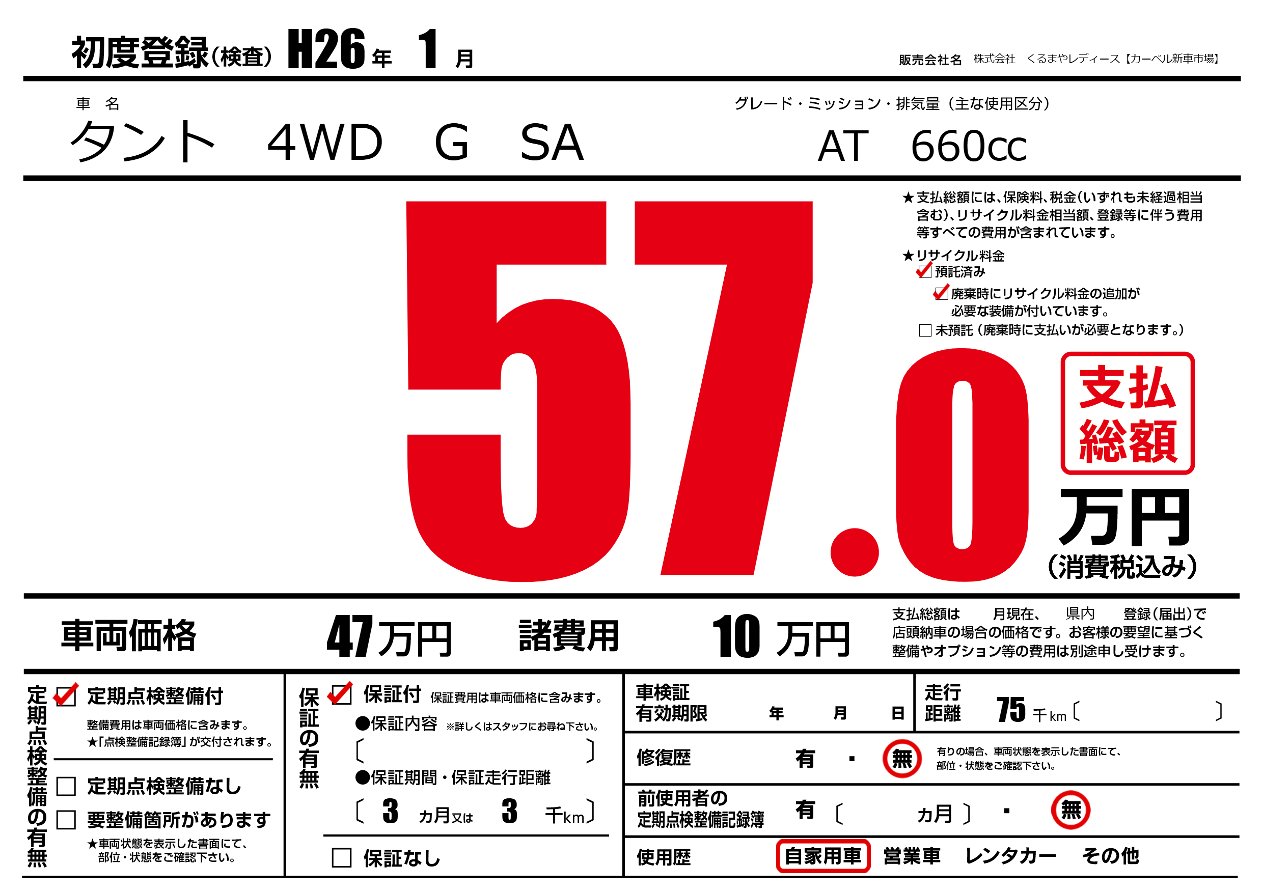| 車名 | タント 4WD G SA | グレード ミッション 排気量 |