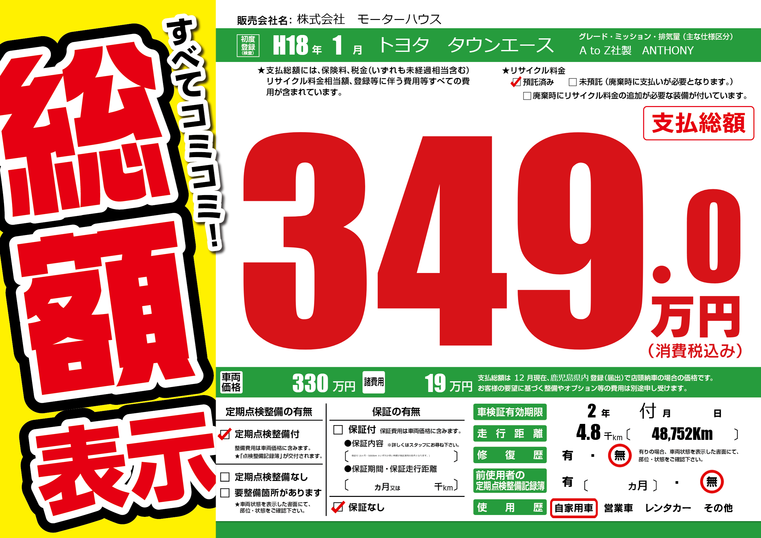 | 車名 | トヨタ タウンエース | グレード ミッション 排気量 |