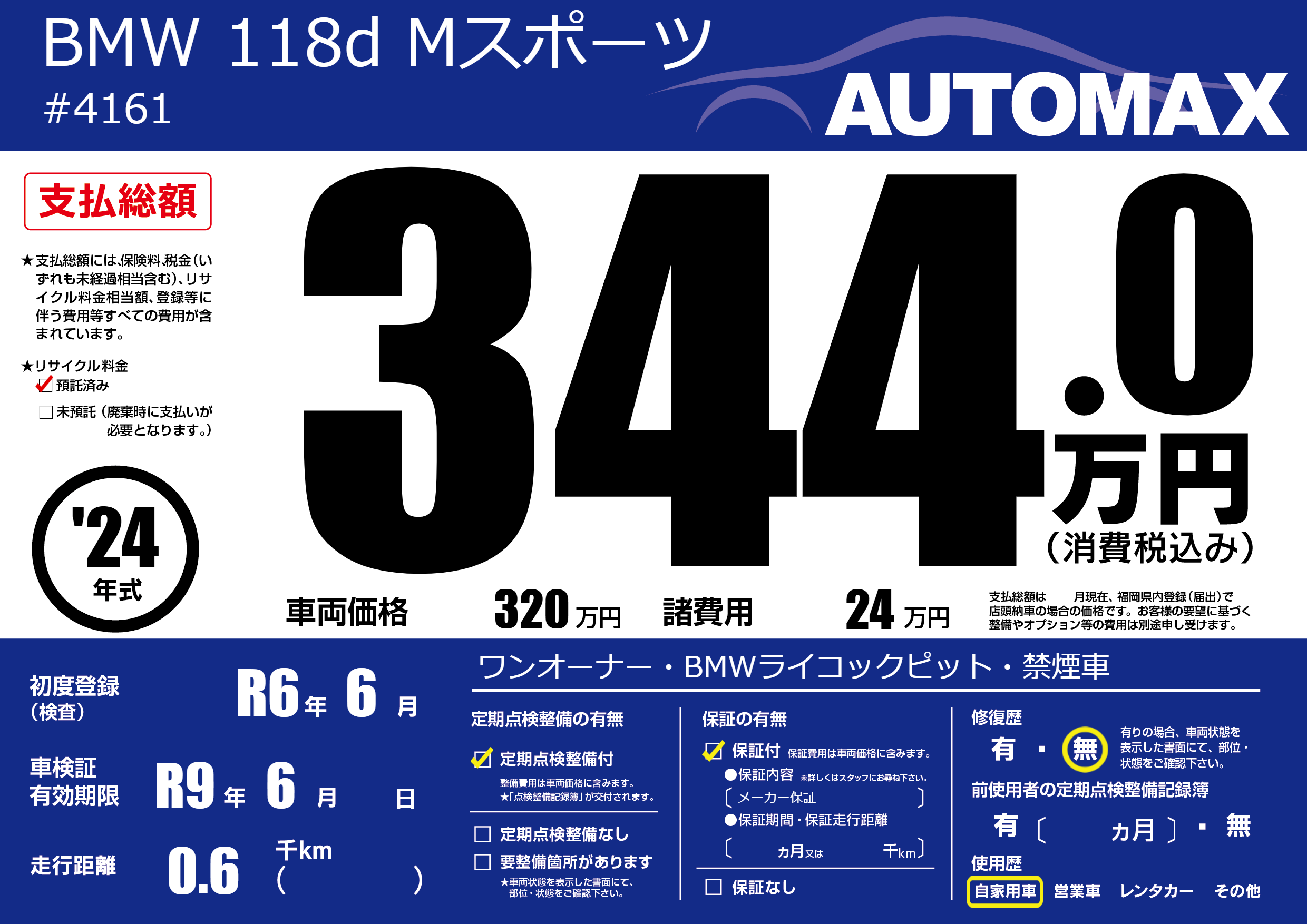 | 車名 | BMW 118d Mスポーツ | グレード ミッション 排気量 |