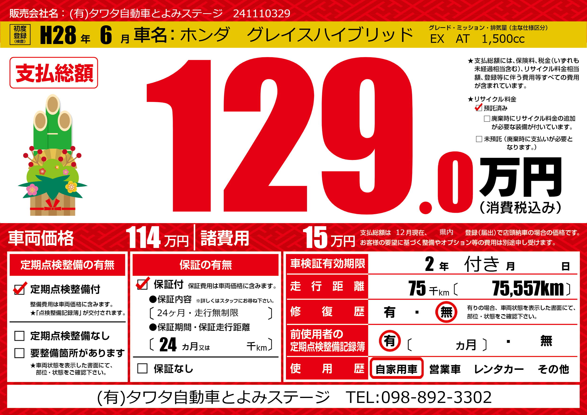 | 車名 | ホンダ グレイスハイブリッド | グレード ミッション 排気量 |