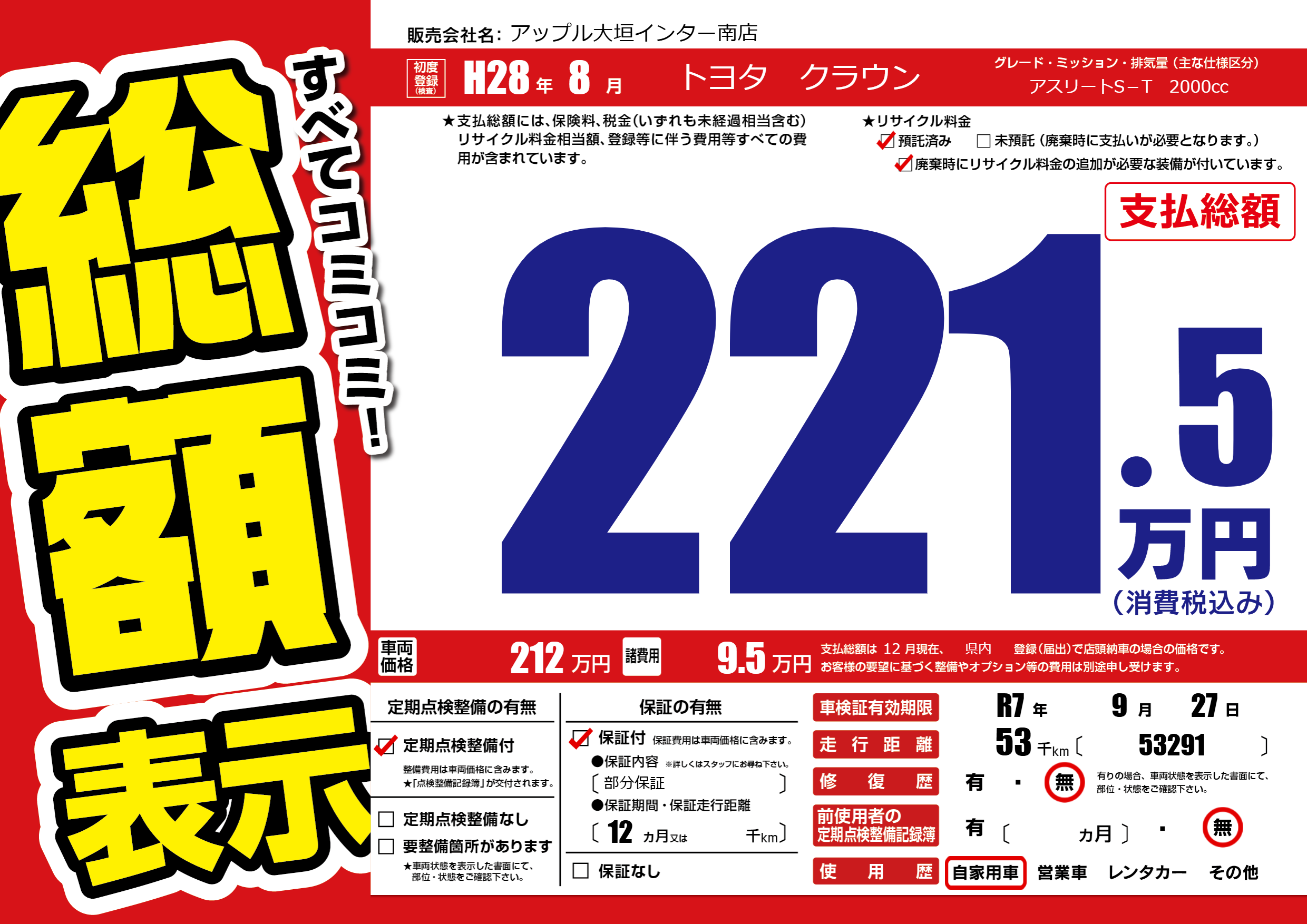 | 車名 | トヨタ クラウン | グレード ミッション 排気量 |