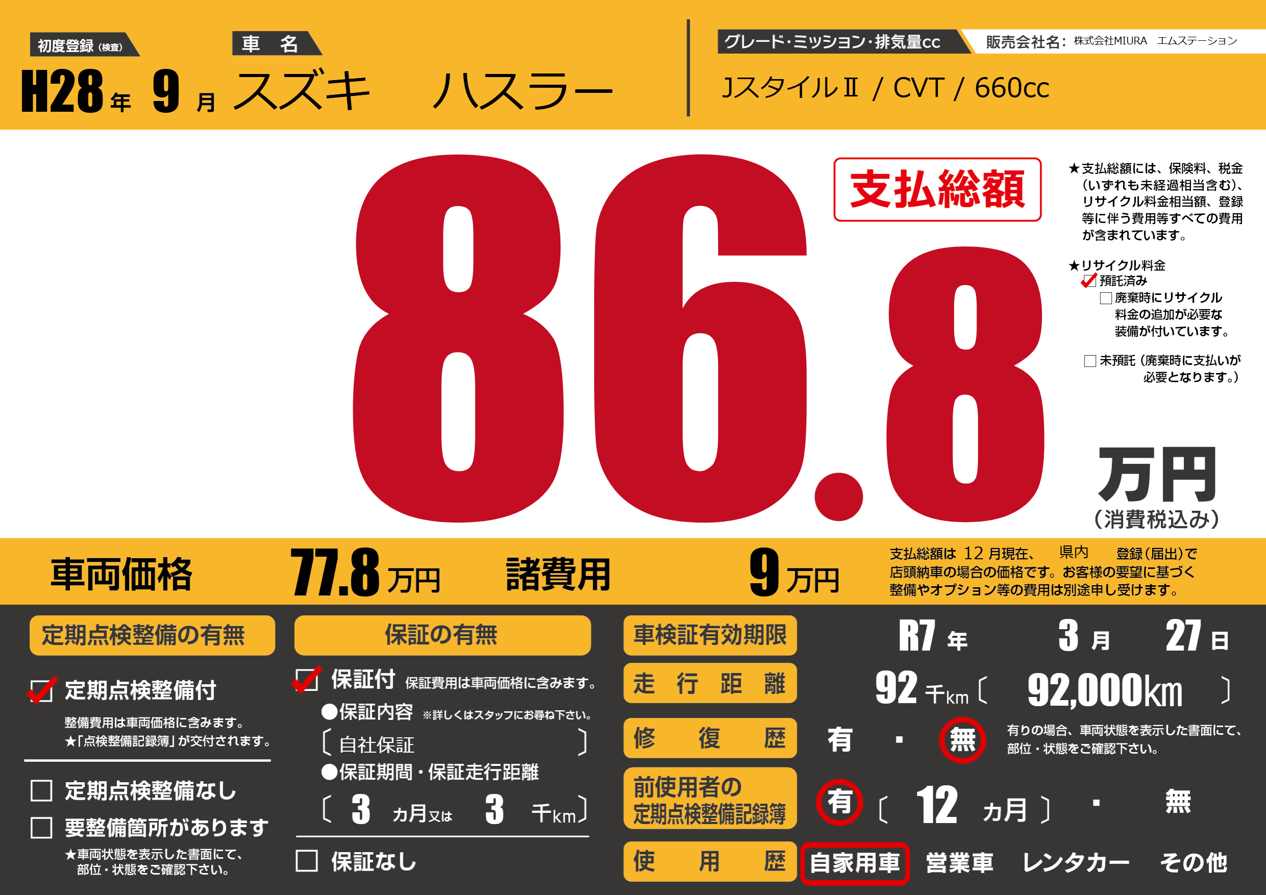 | 走行キロ | 9.2万km | 初年度登録 | H28年9月 |