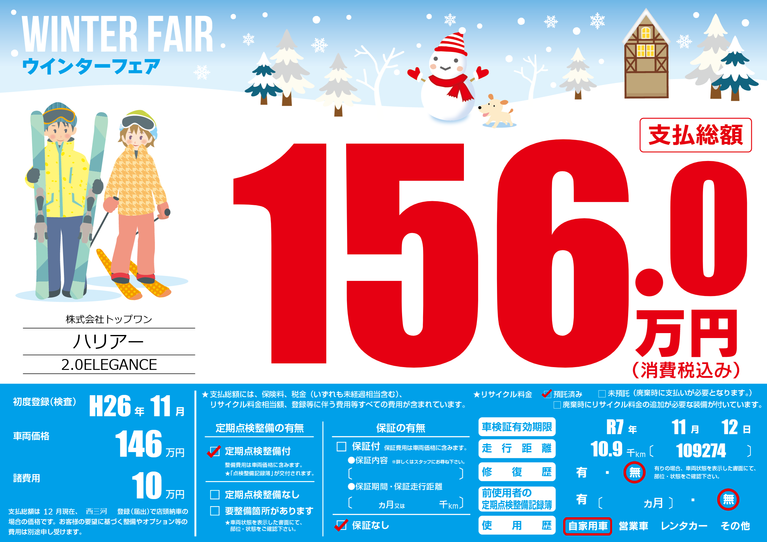 | 走行キロ | 1万km | 初年度登録 | H26年11月 |