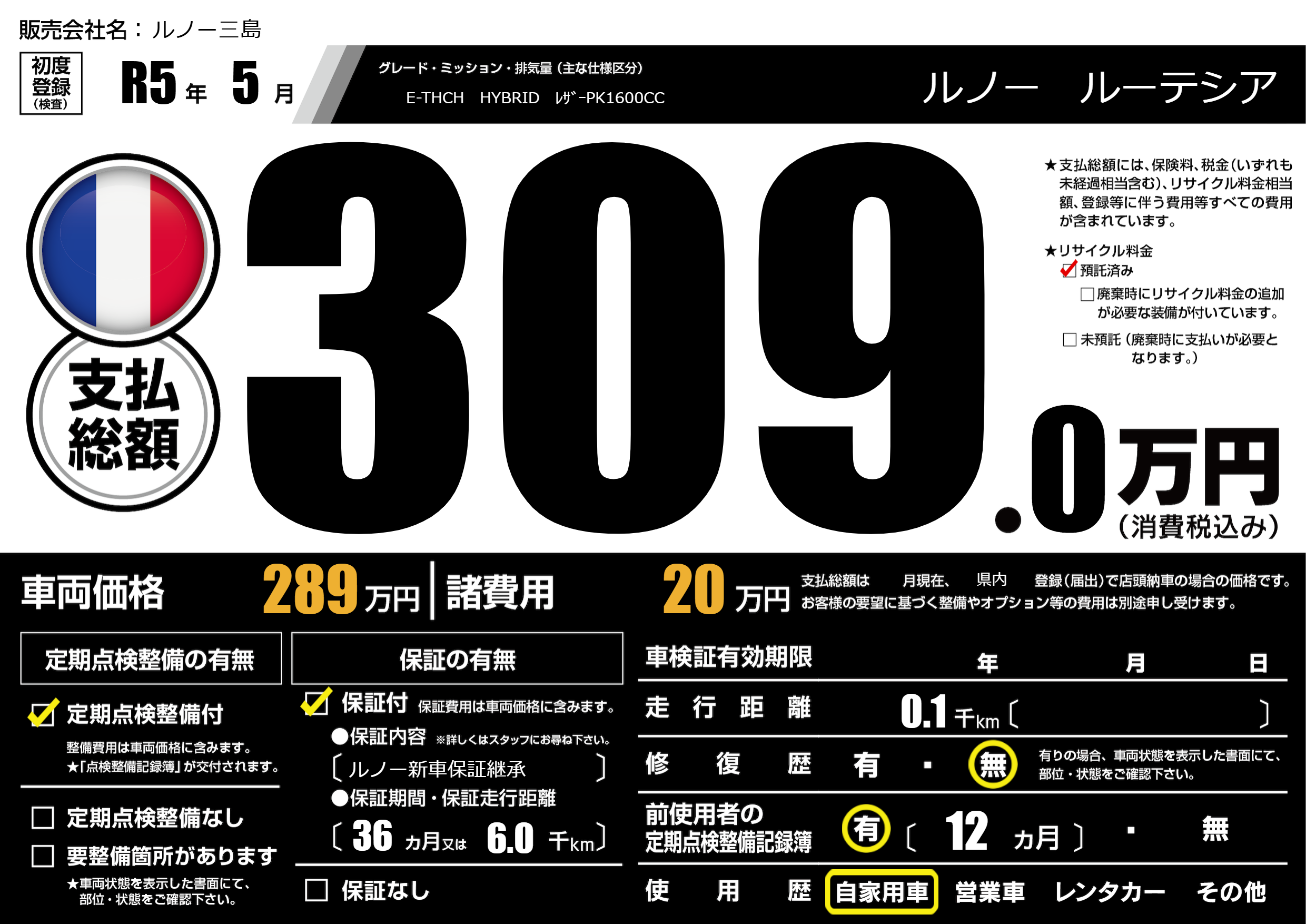 保証なし 保証内容(ルノー新車保証継承) 36ヶ月または(6.0)千kmまで |