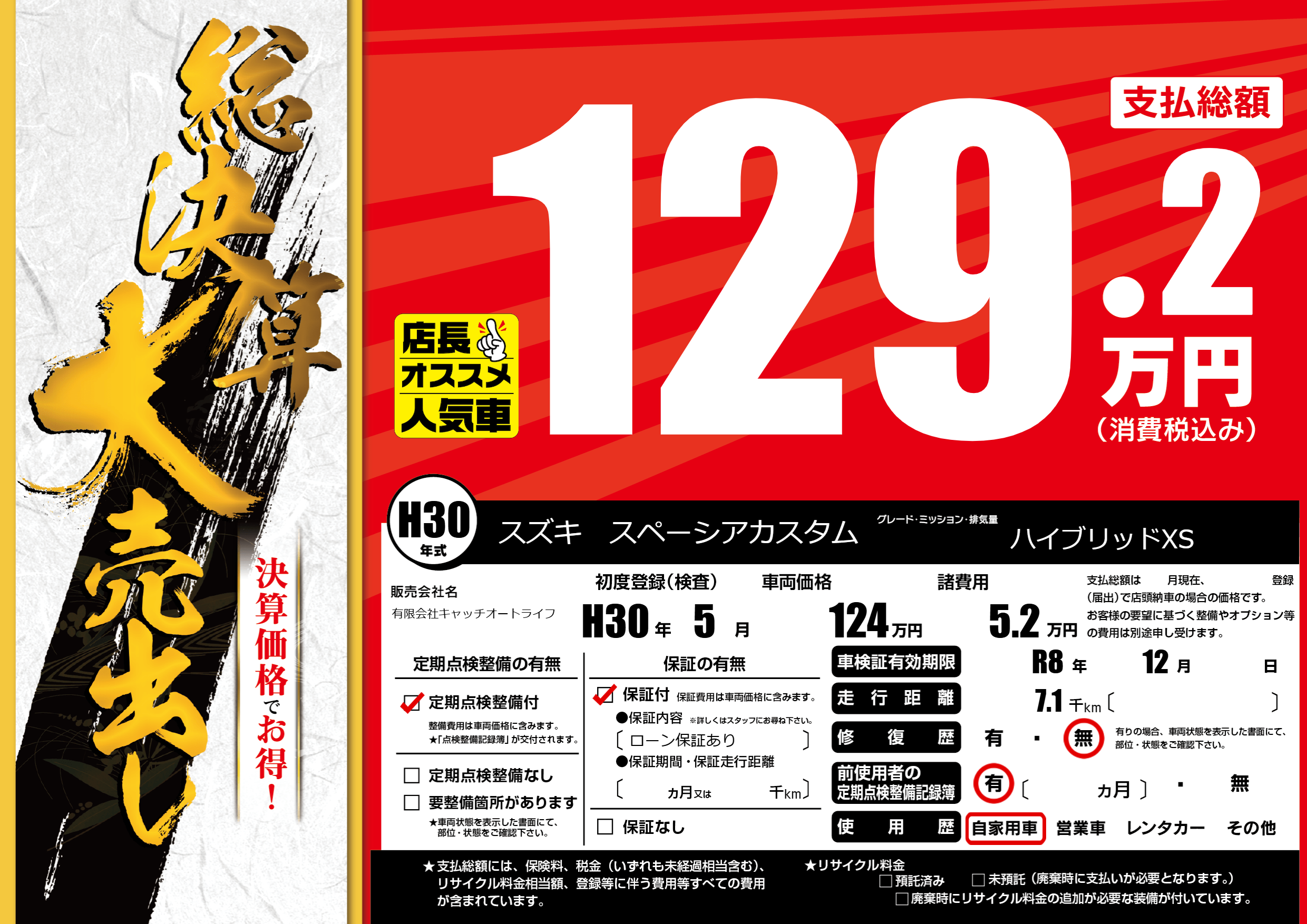 | 走行キロ | 0.7万km | 初年度登録 | H30年5月 |