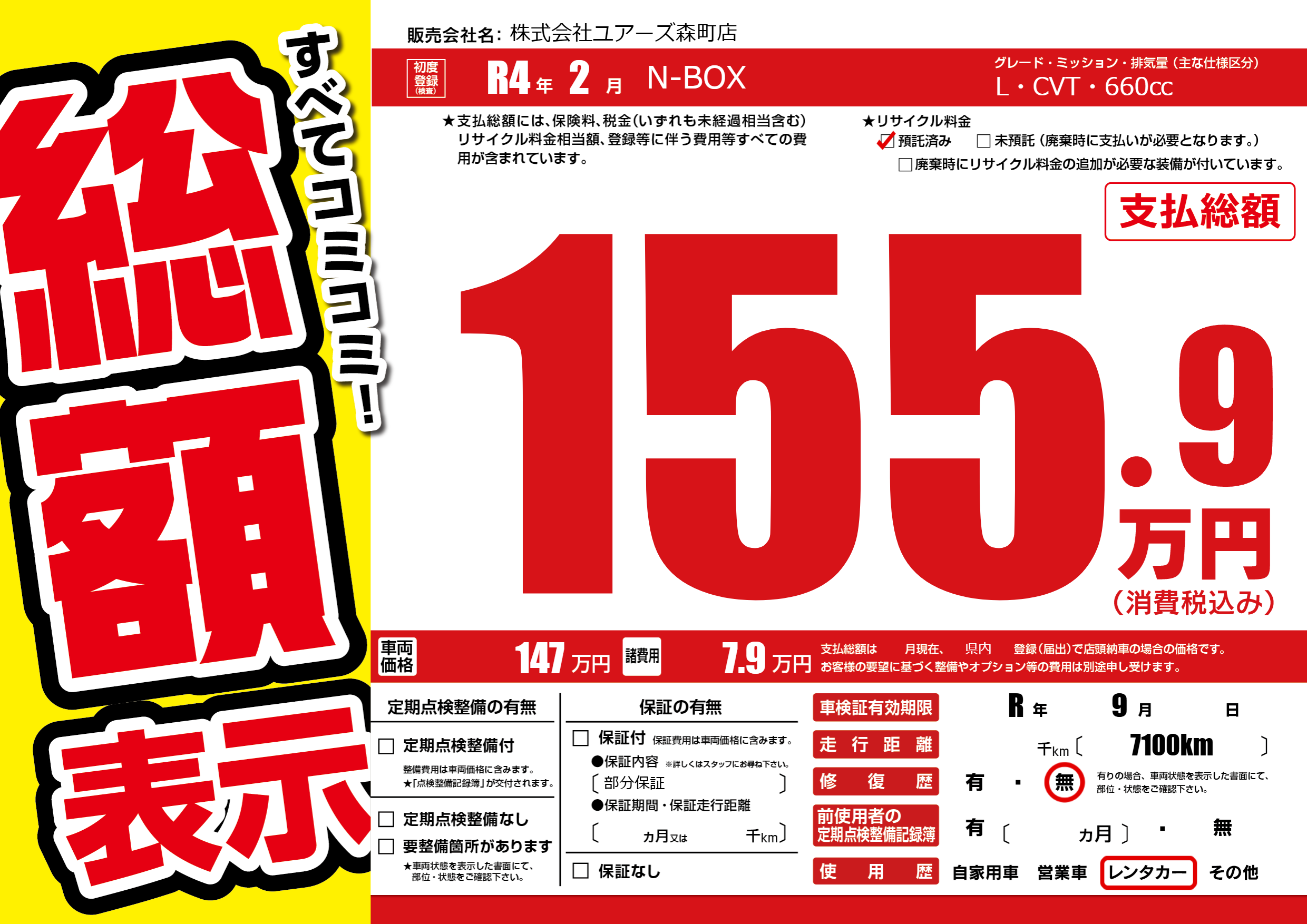 | 車検制限 | R年 9月 - 日 | ||