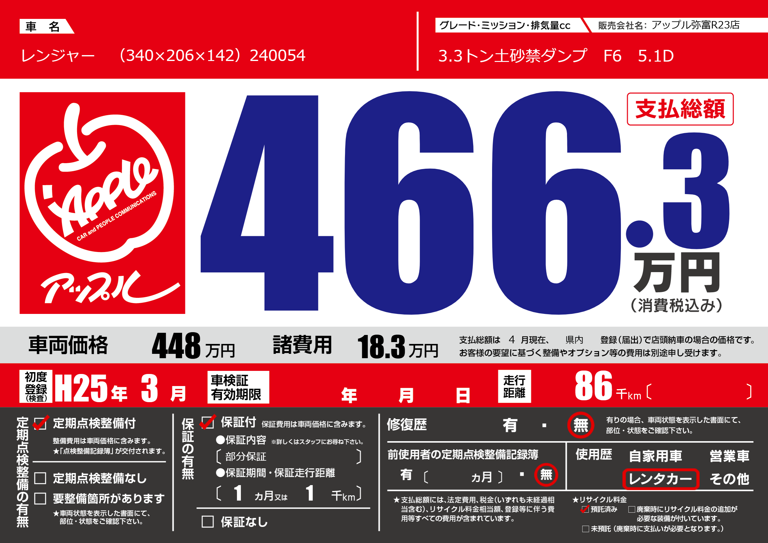 | 走行キロ | 8.6万km | 初年度登録 | H25年3月 |