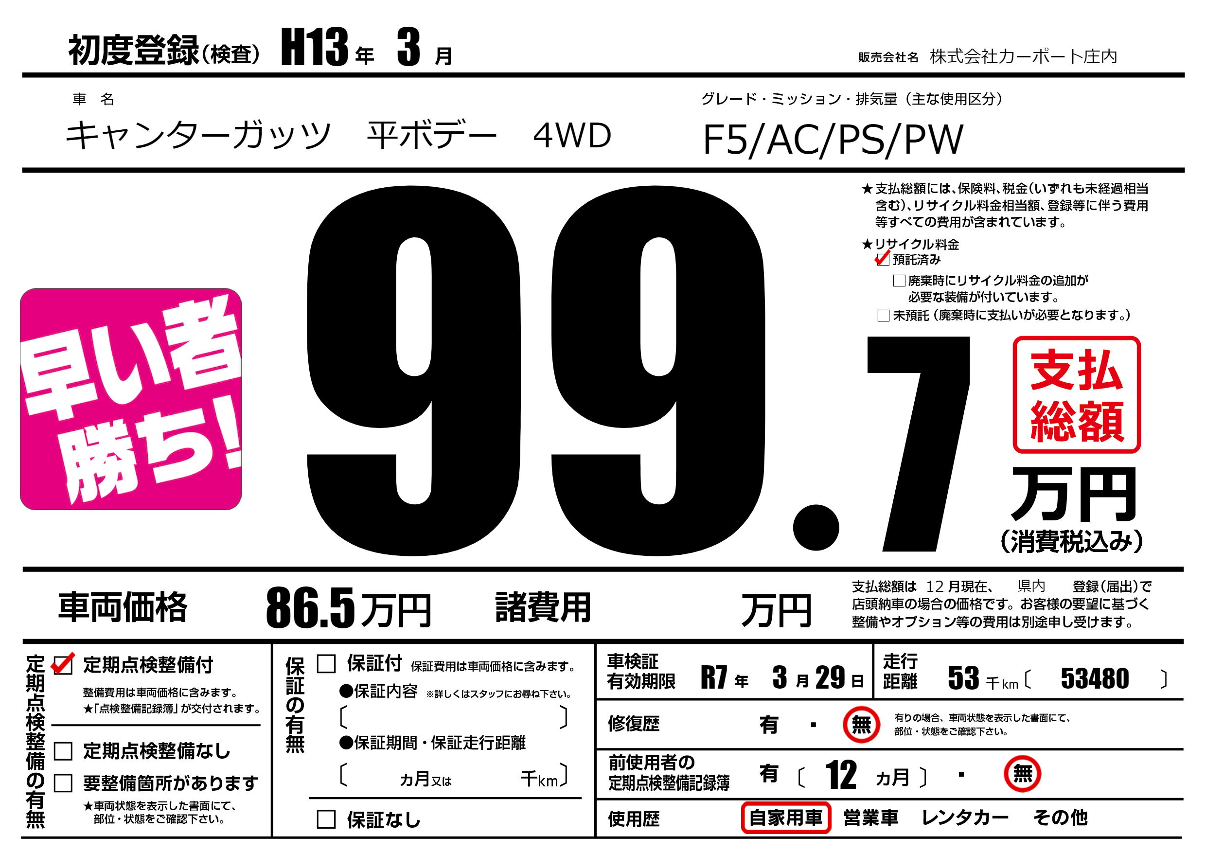 | 車名 | キャンターガッツ 平ボデー 4WD | グレード ミッション 排気量 |