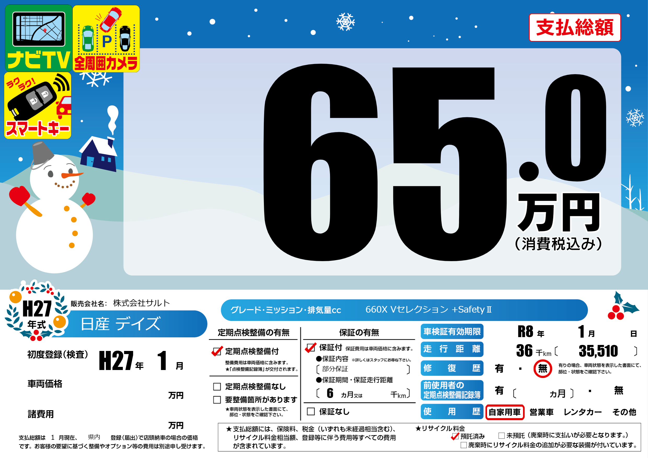 | 車名 | 日産 デイズ | グレード ミッション 排気量 |