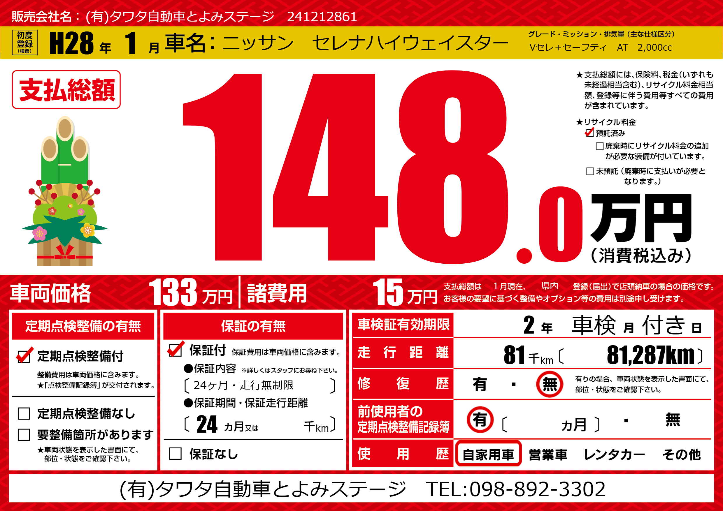 | 走行キロ | 8.1万km | 初年度登録 | H28年1月 |