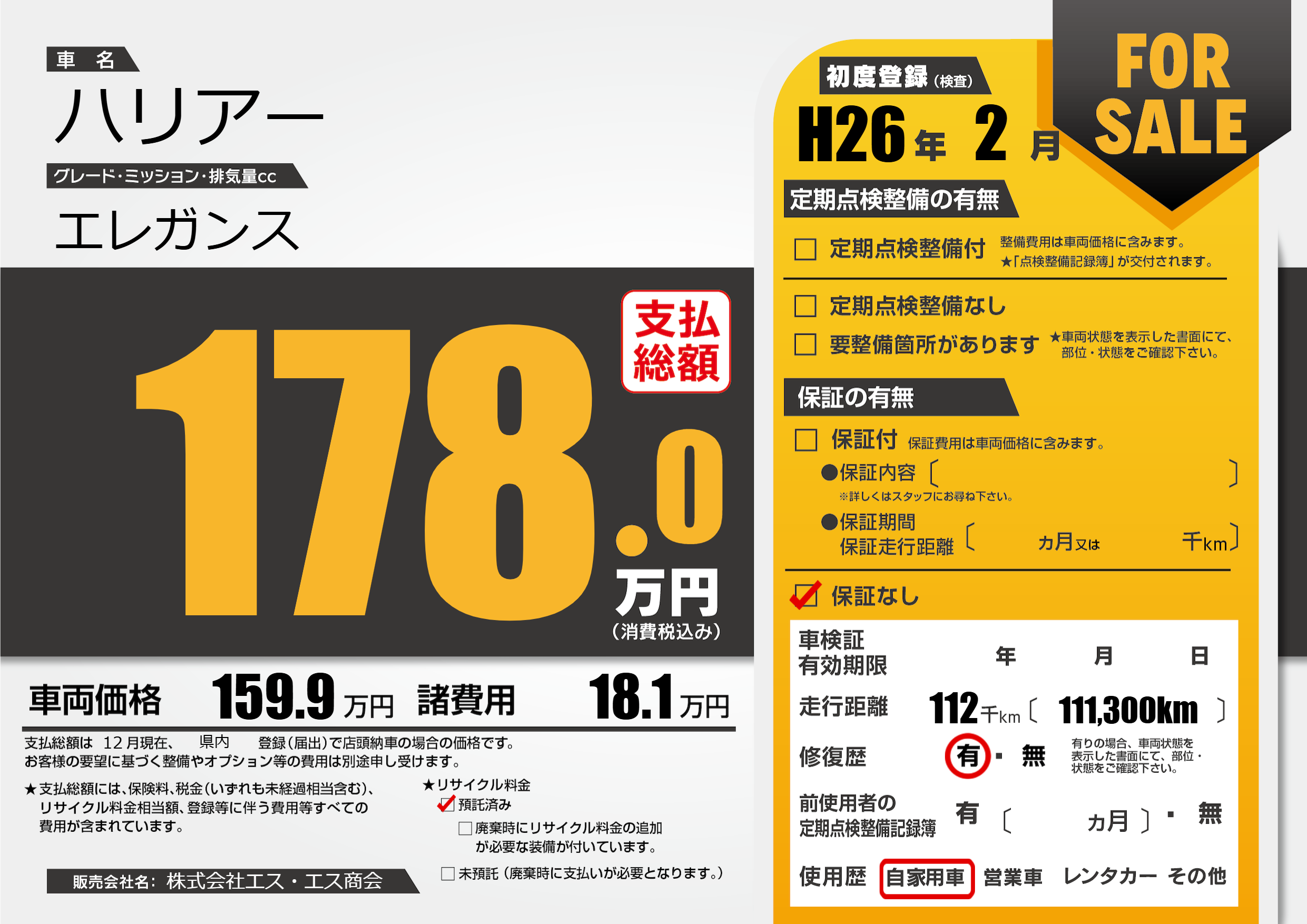 | 走行キロ | 11.2万km | 初年度登録 | H26年2月 |