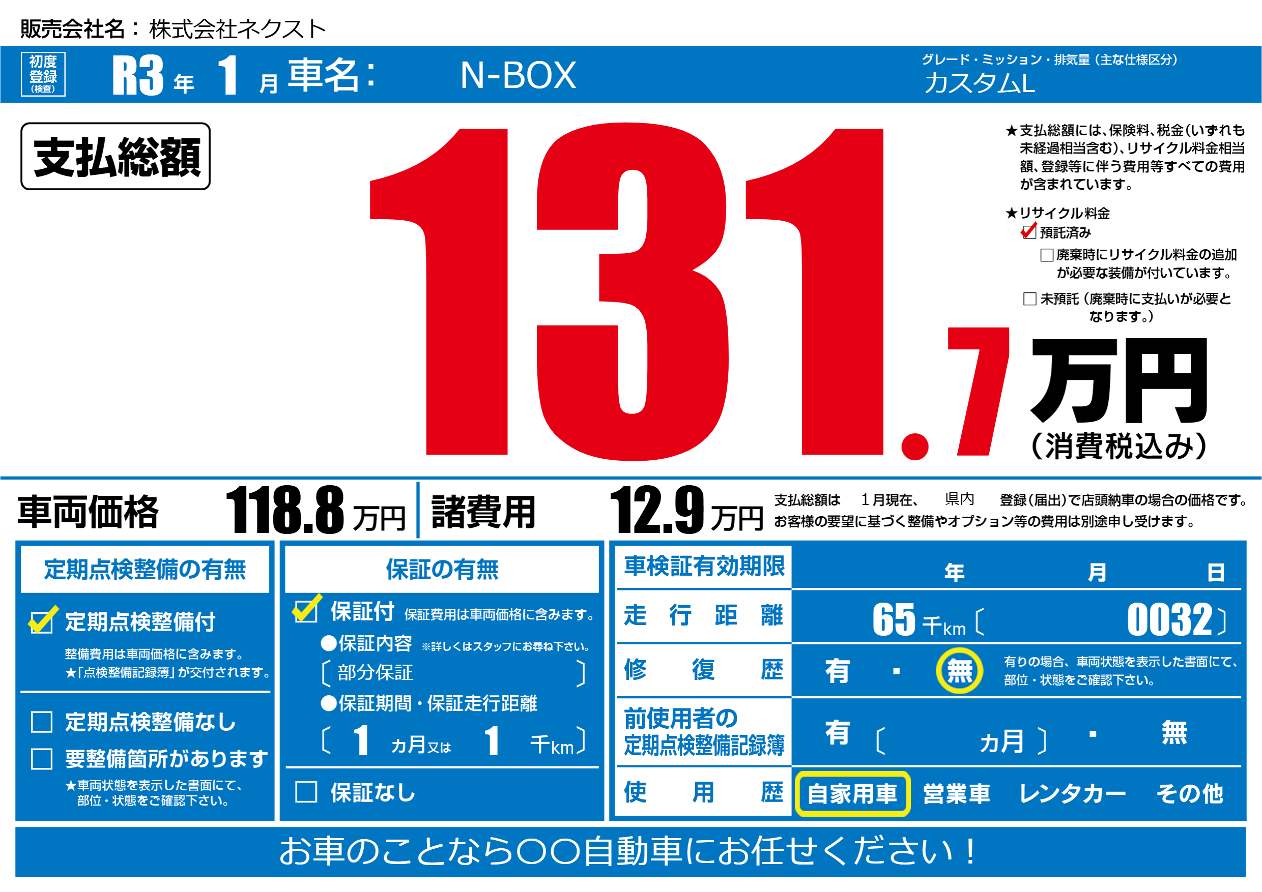 | 車名 | N-BOX | グレード ミッション 排気量 |
