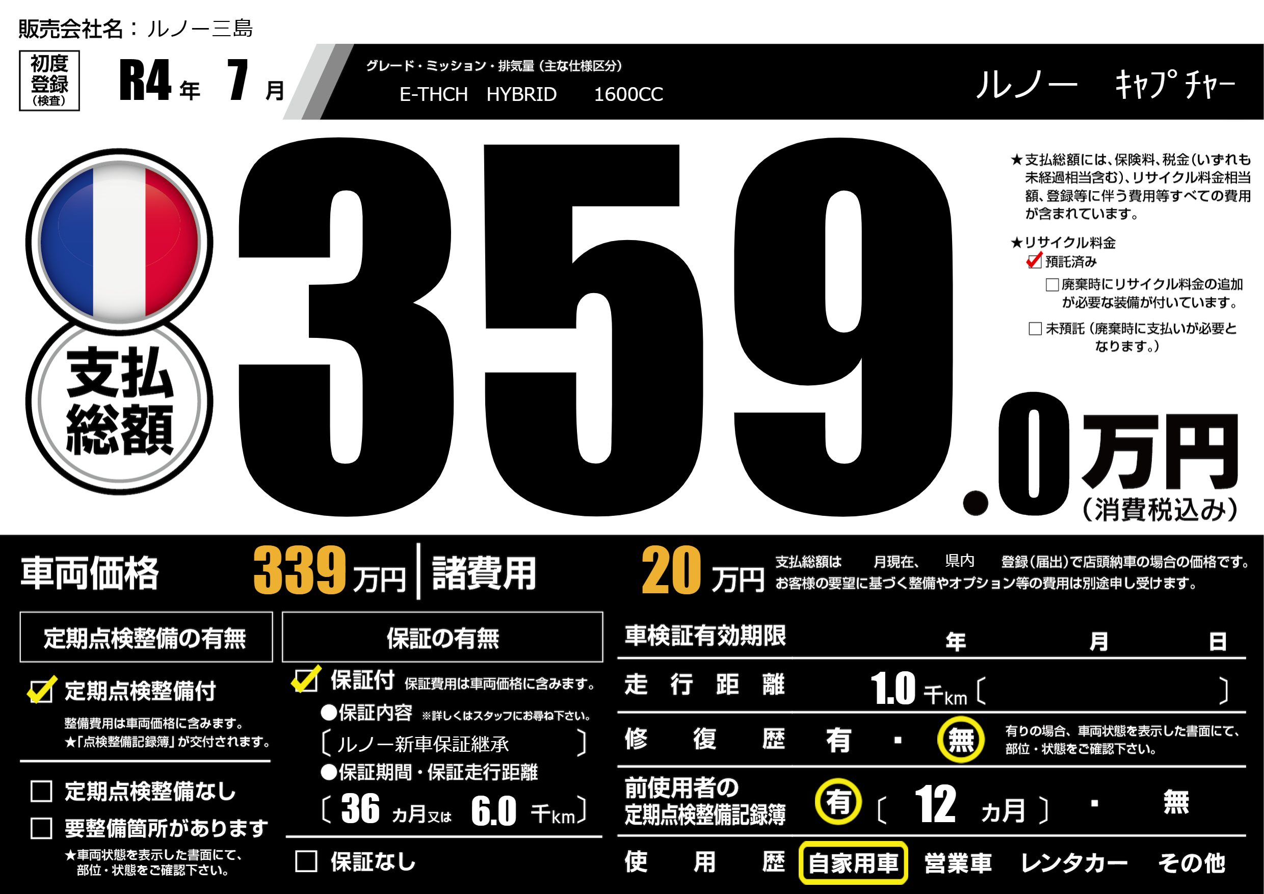 保証なし 保証内容(ルノー新車保証継承) 36ヶ月または(6.0)千kmまで |