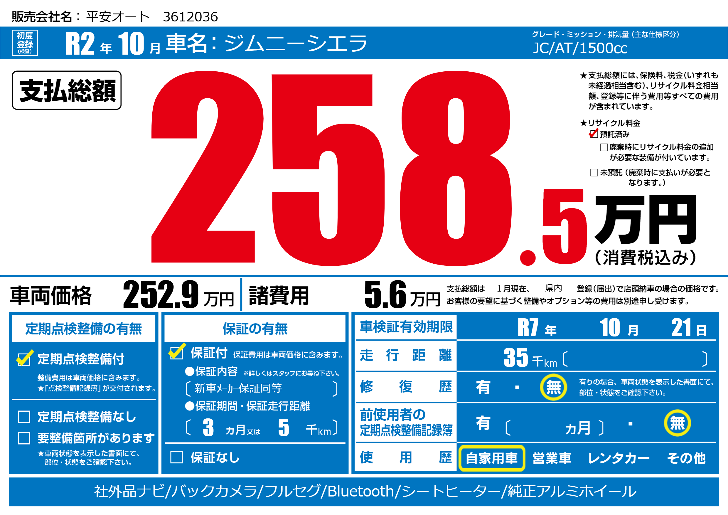 | 車検制限 | R7年 10月 21日 | ||