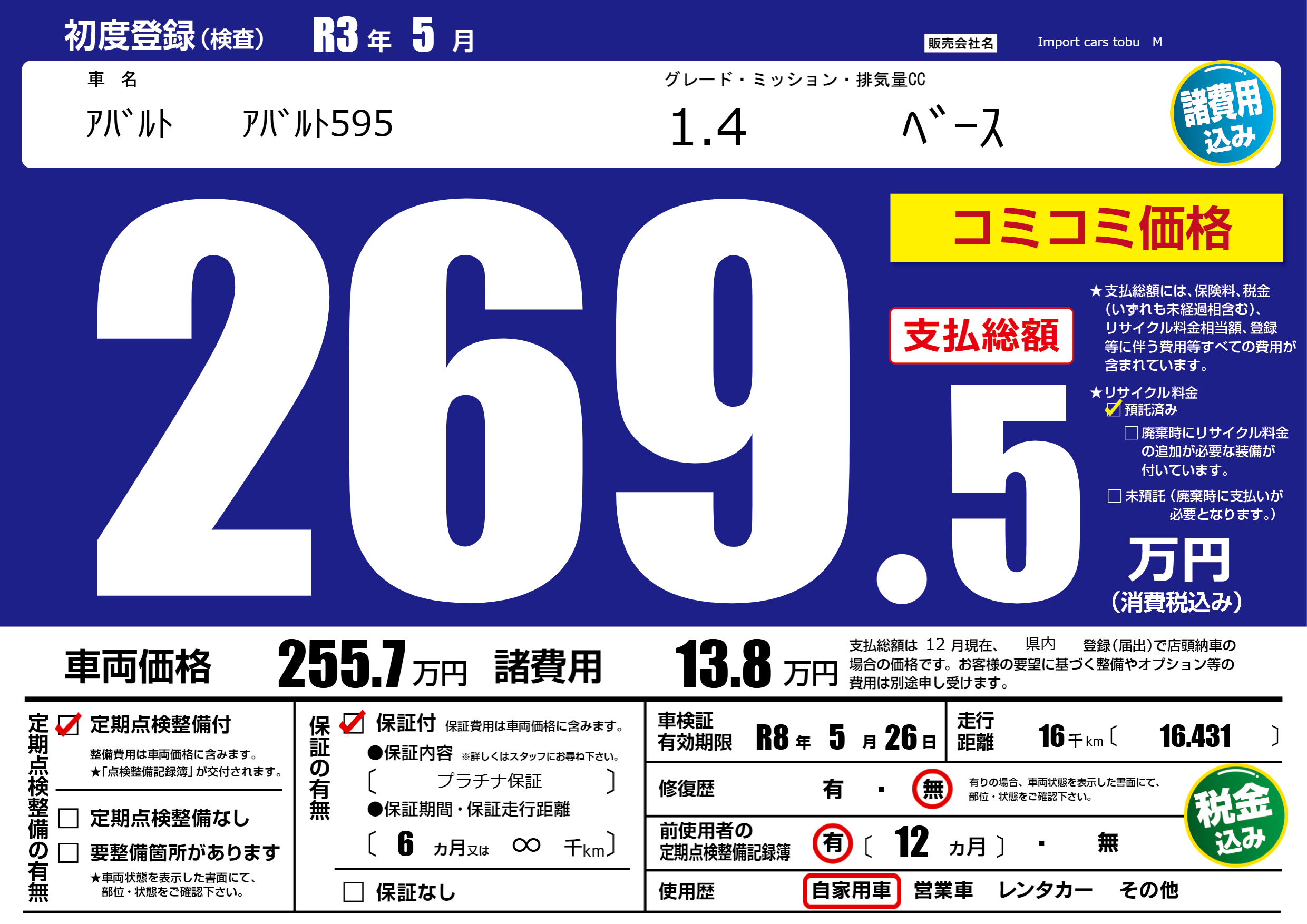 | 車名 | アバルト アバルト595 | グレード ミッション 排気量 |