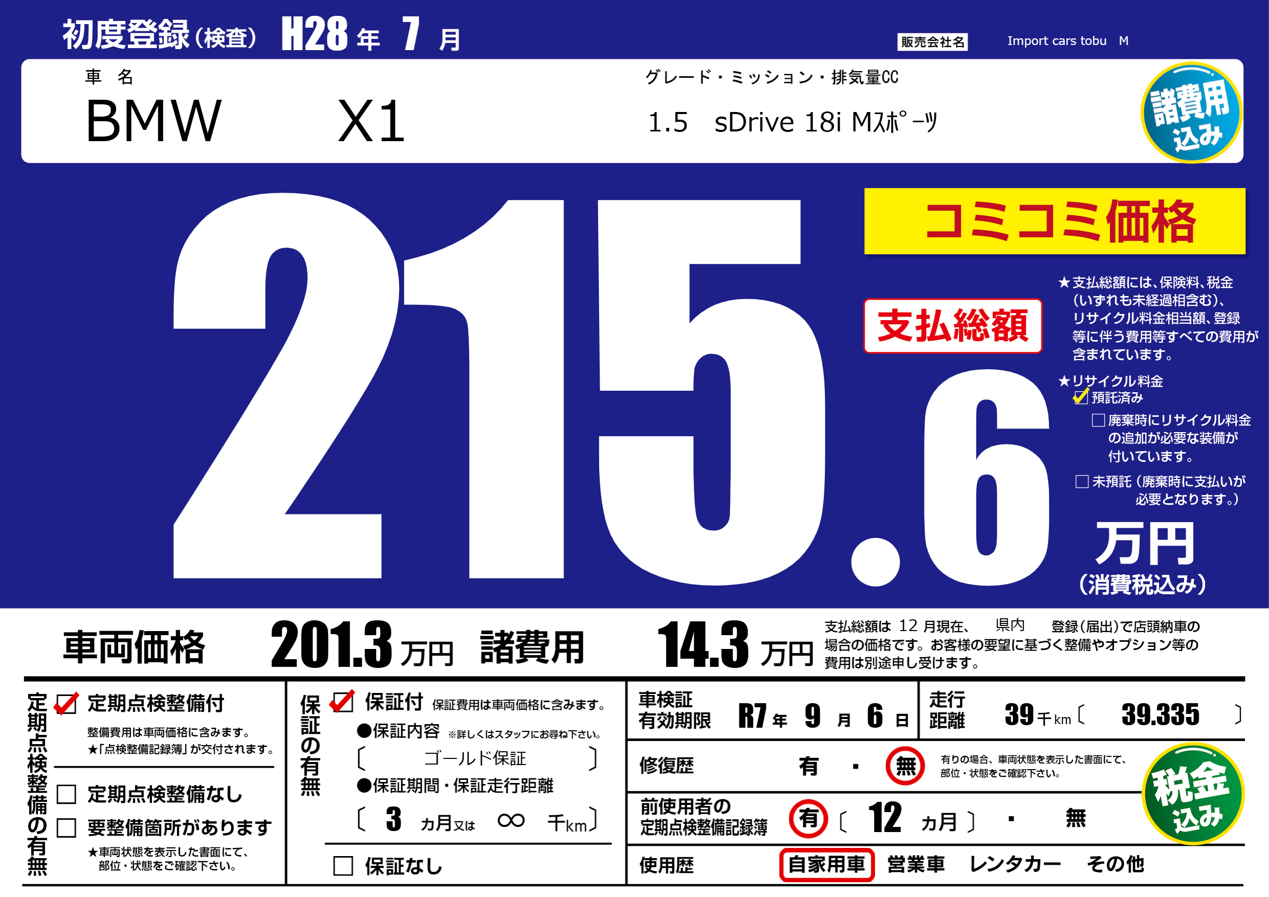 | 車名 | BMW X1 | グレード ミッション 排気量 |