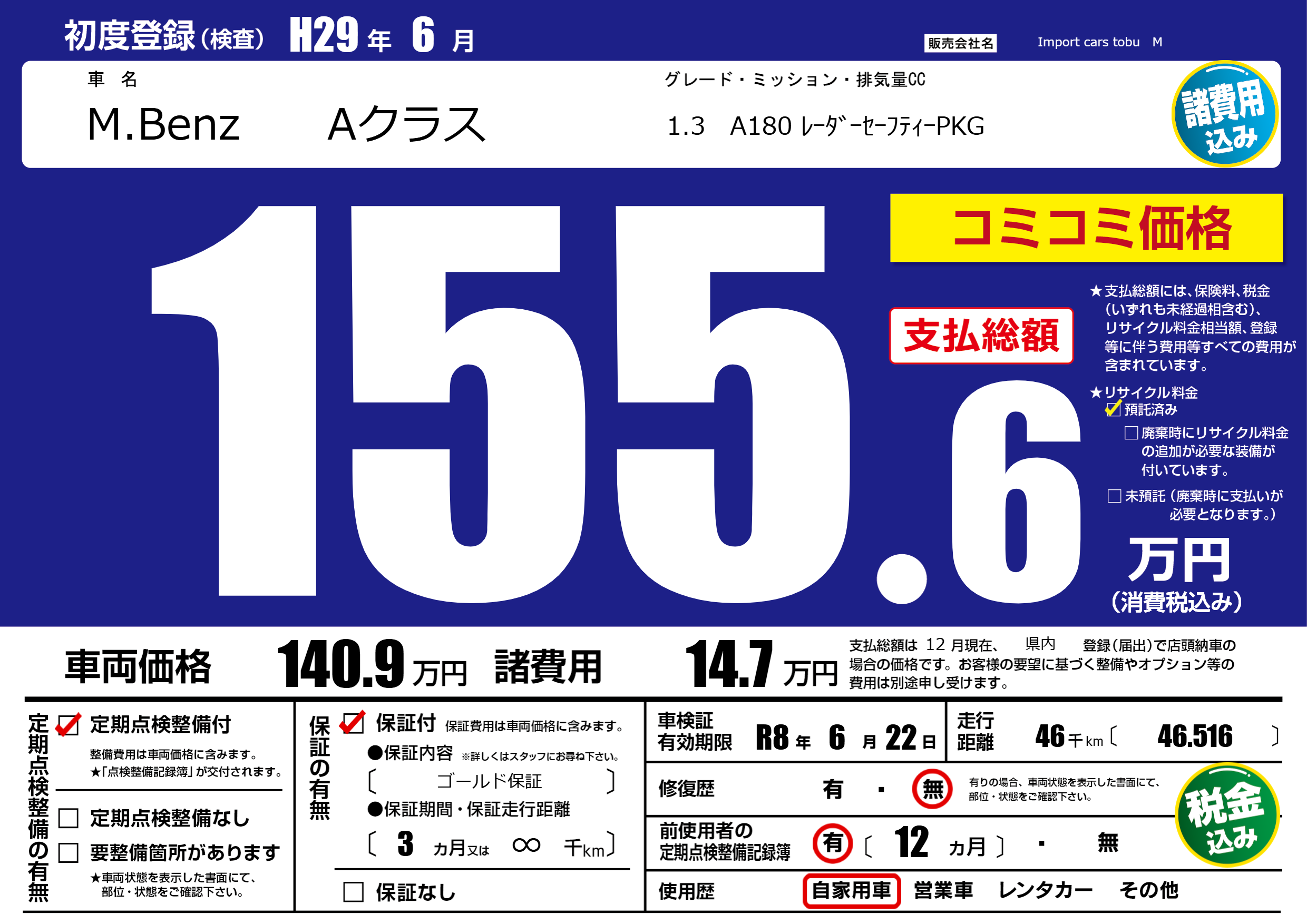 | 車名 | M.Benz Aクラス | グレード ミッション 排気量 |