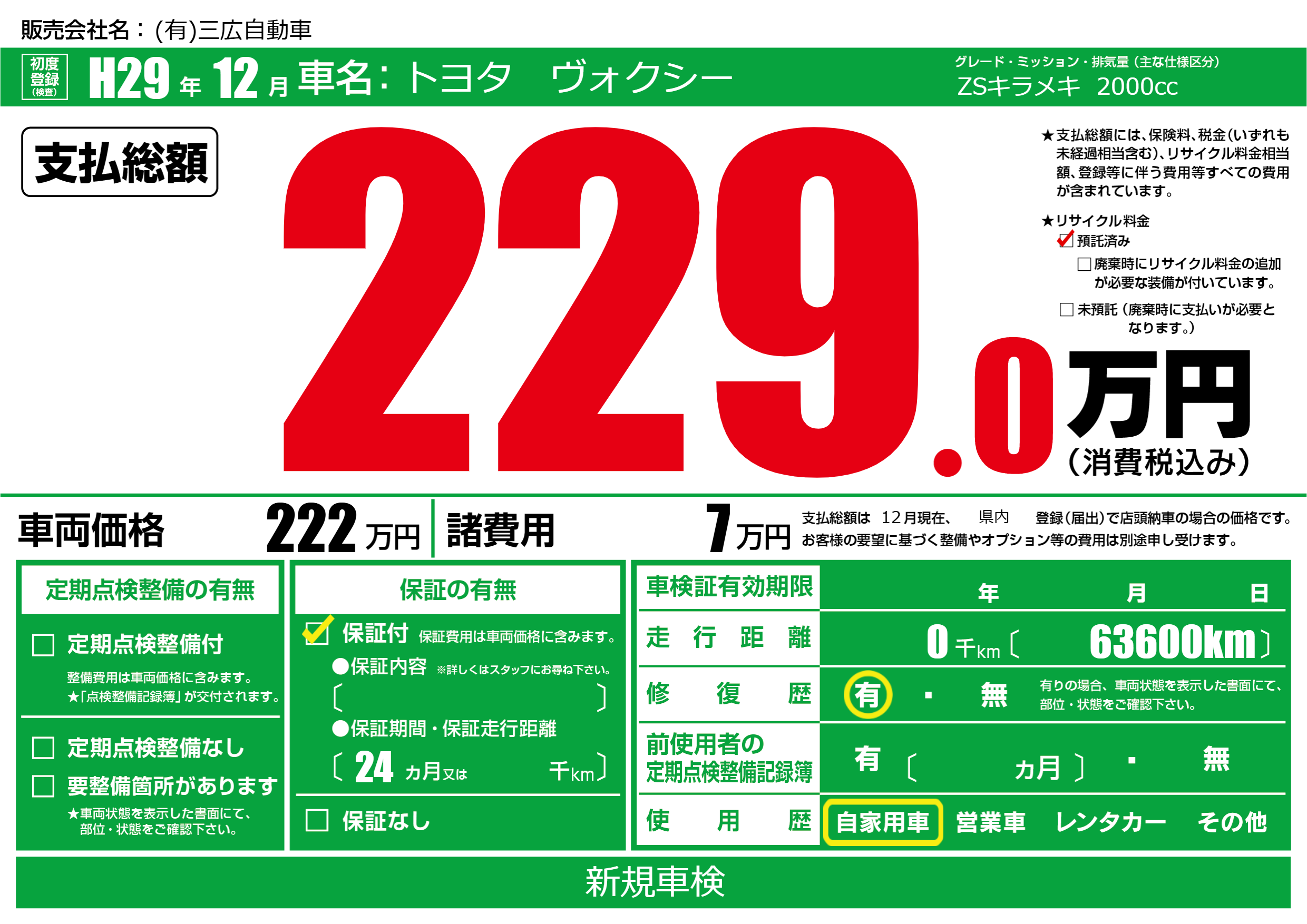 | 車名 | トヨタ ヴォクシー | グレード ミッション 排気量 |