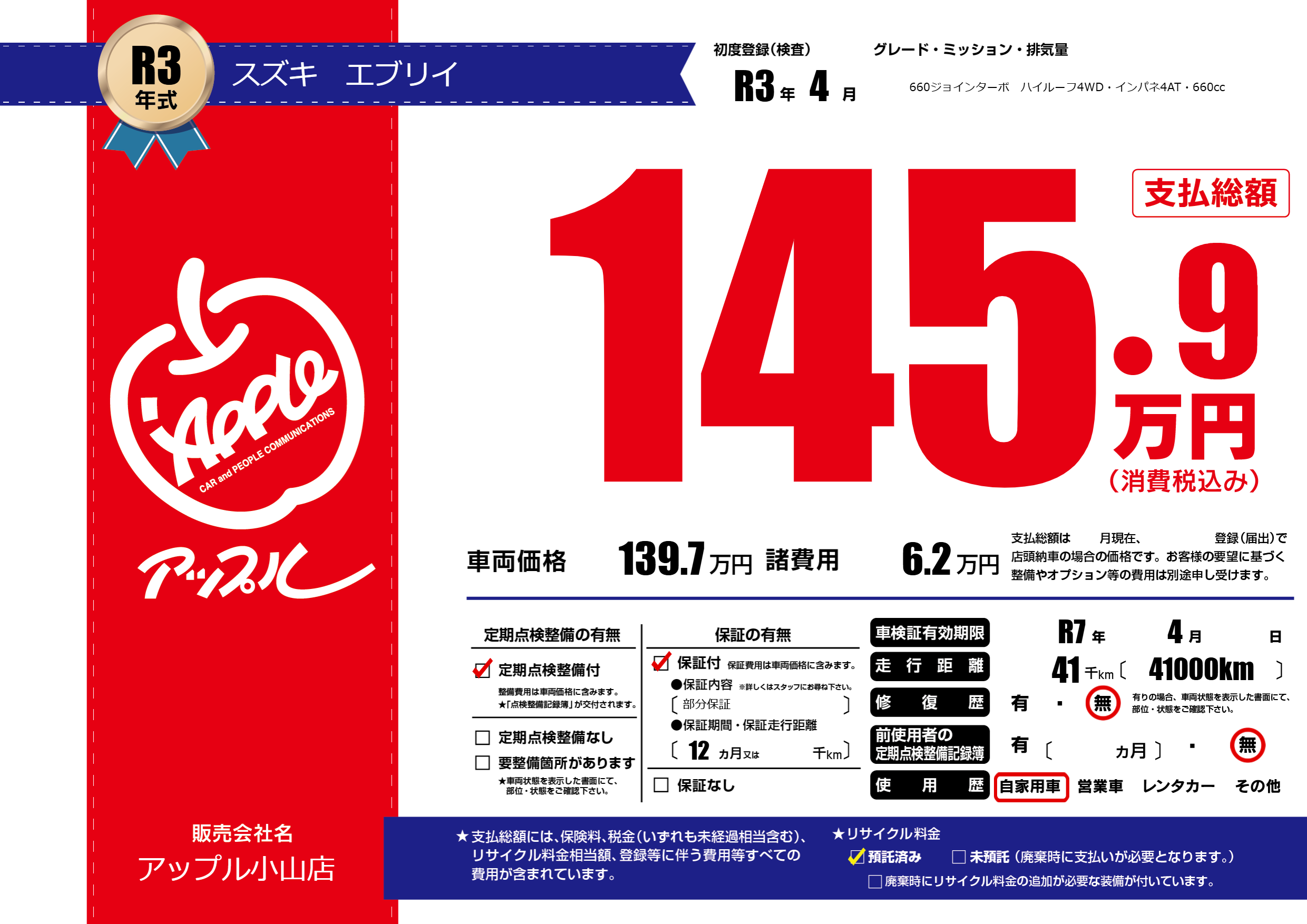 | 走行キロ | 4.1万km | 初年度登録 | R3年4月 |