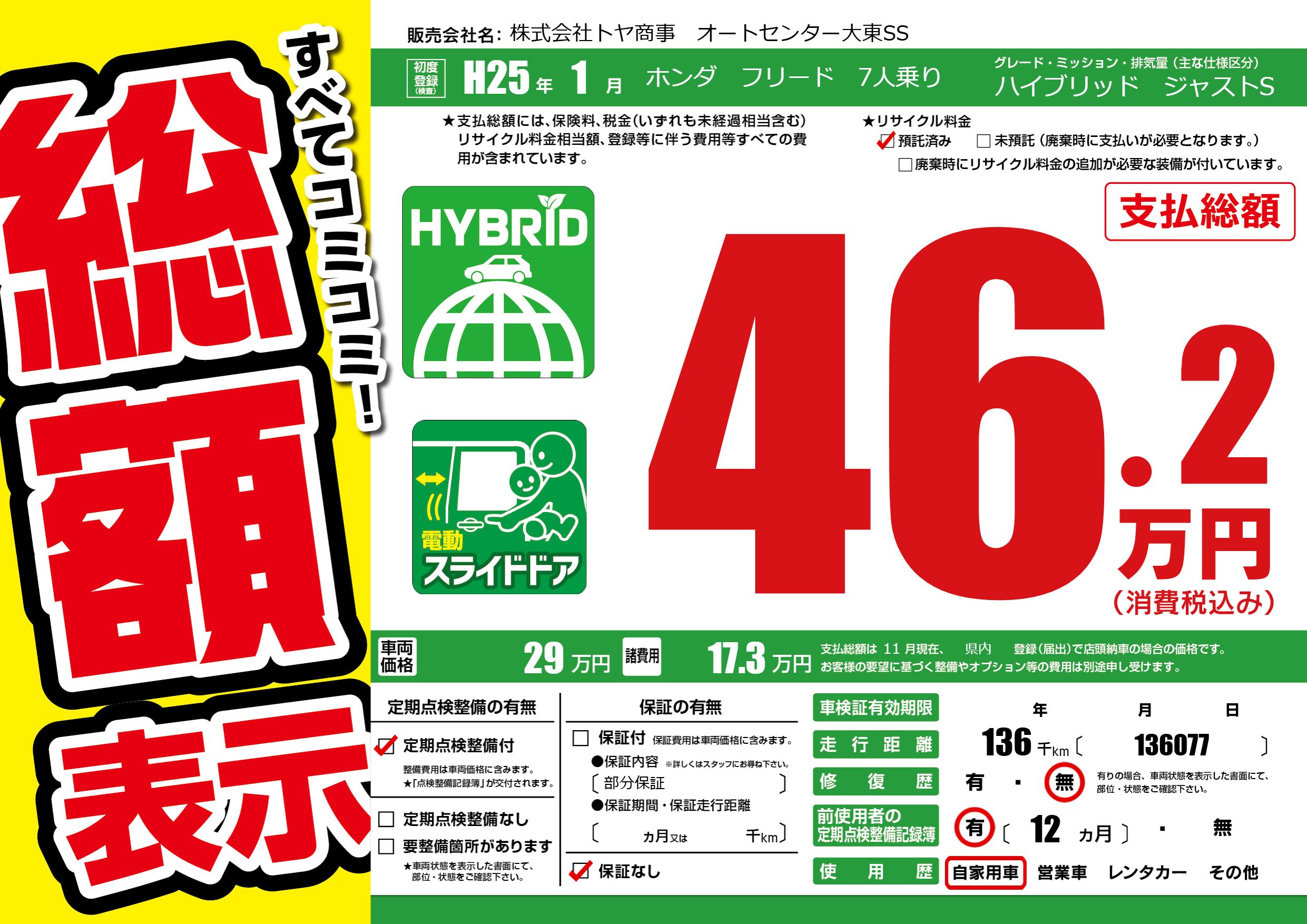 | 車名 | ホンダ フリード 7人乗り | グレード ミッション 排気量 |