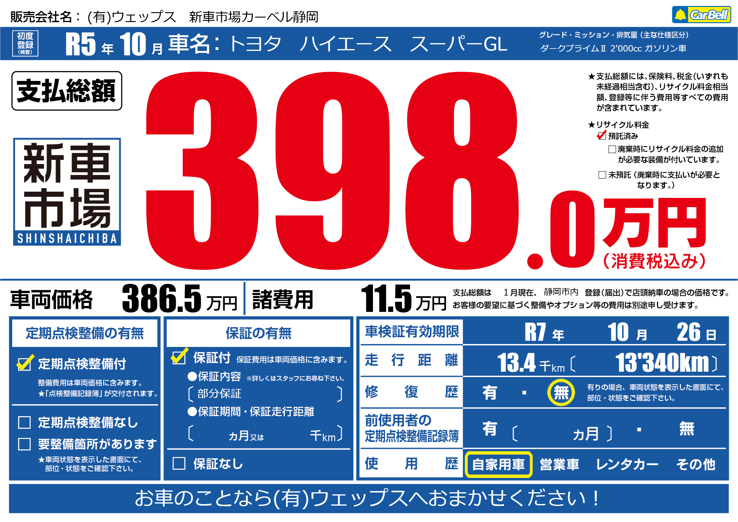 | 車名 | トヨタ ハイエース スーパーGL | グレード ミッション 排気量 |