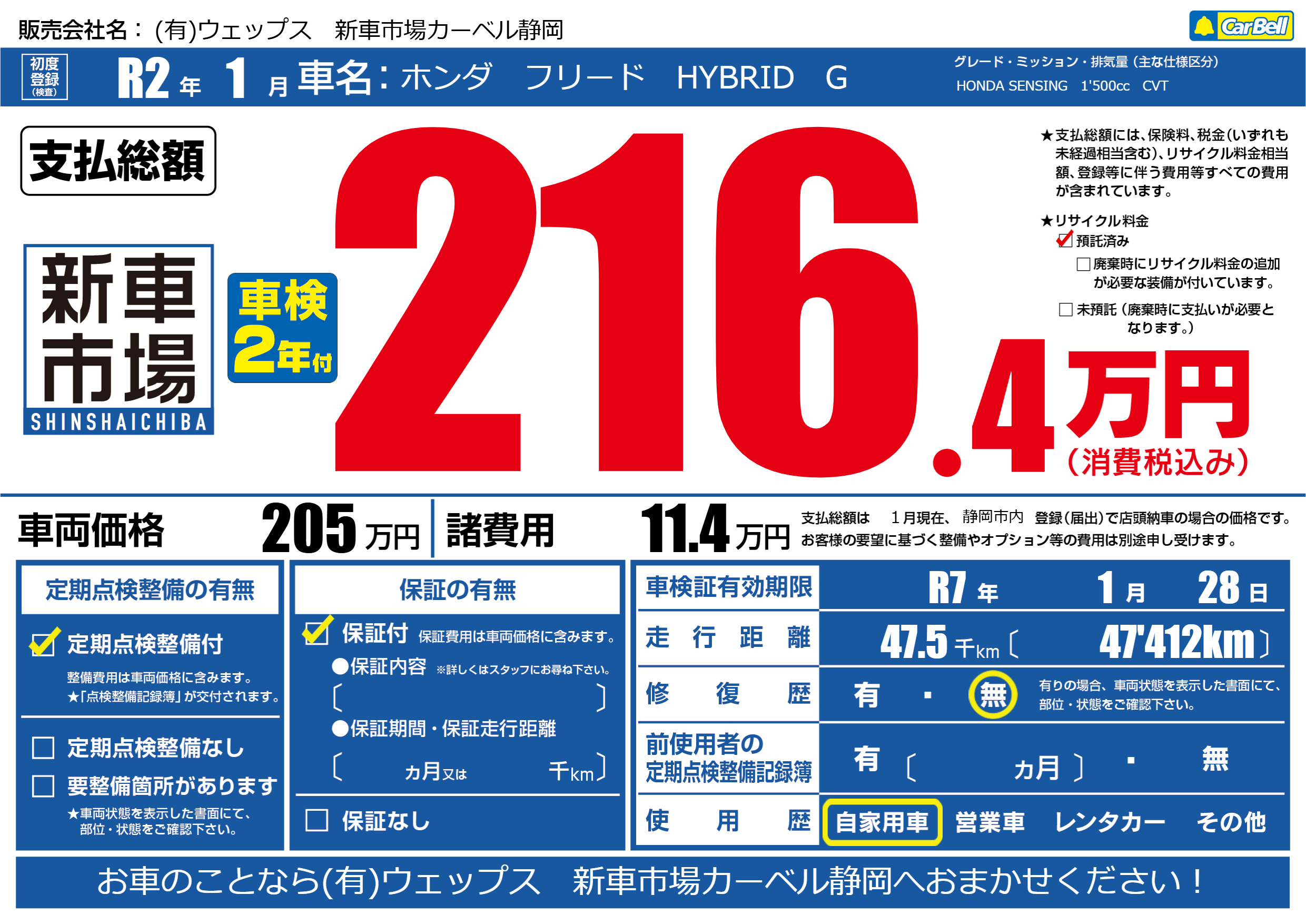 | 車名 | ホンダ フリード HYBRID G | グレード ミッション 排気量 |