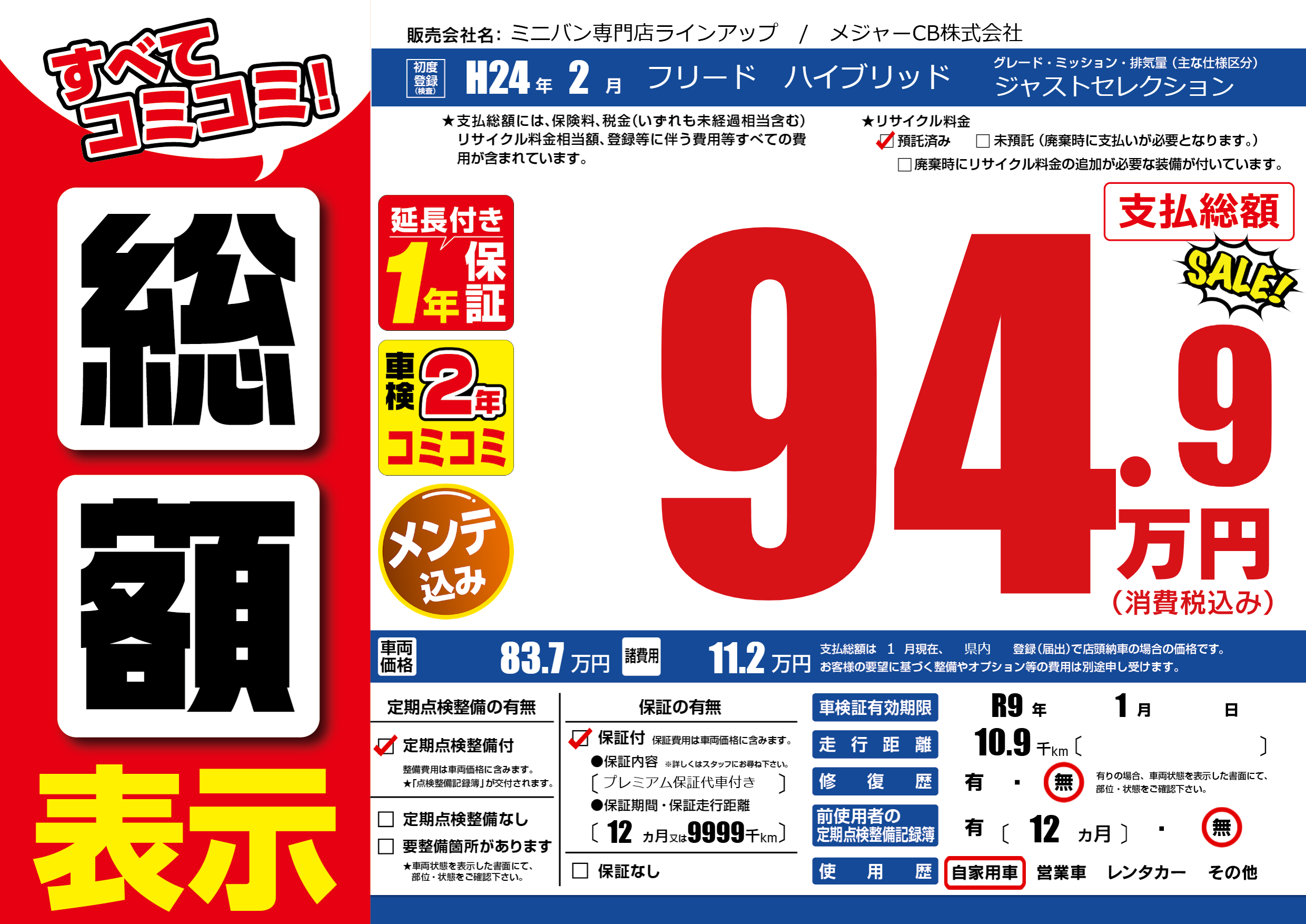 | 走行キロ | 1万km | 初年度登録 | H24年2月 |