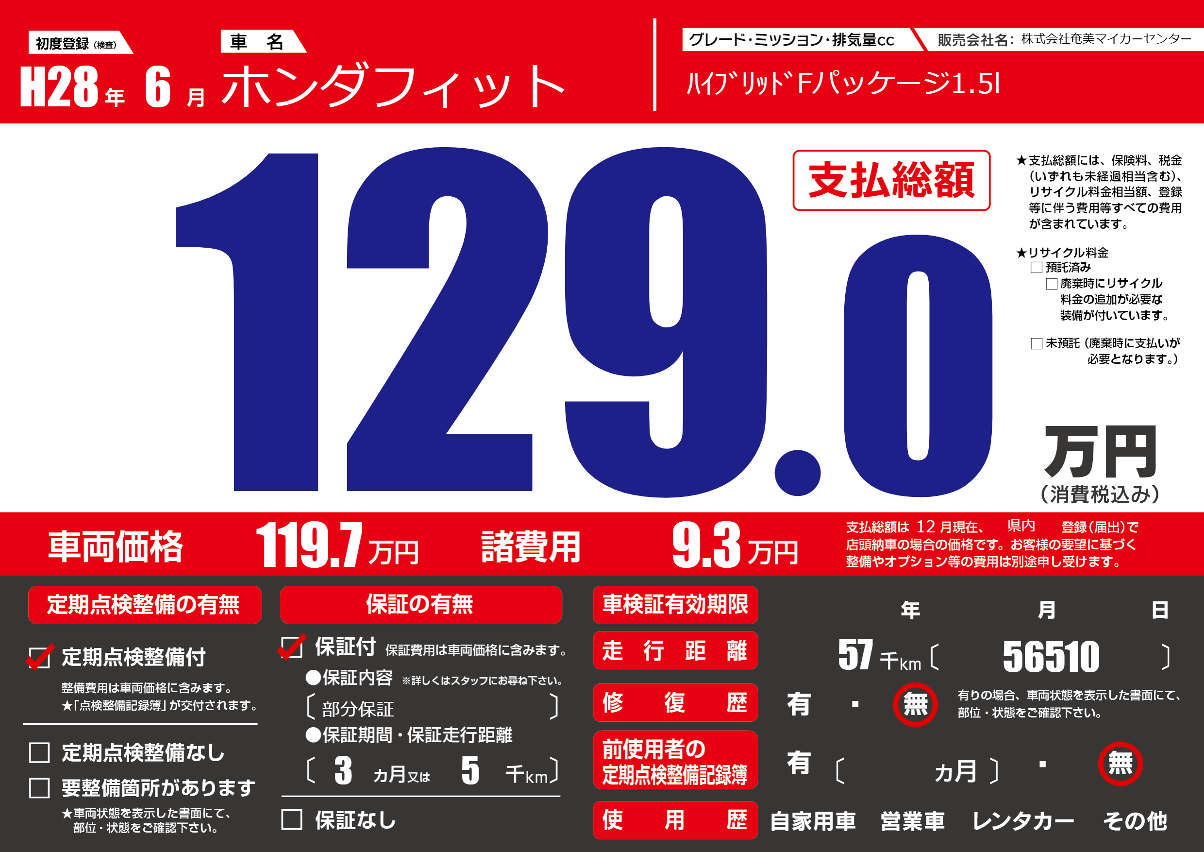 | 車名 | ホンダフィット | グレード ミッション 排気量 |