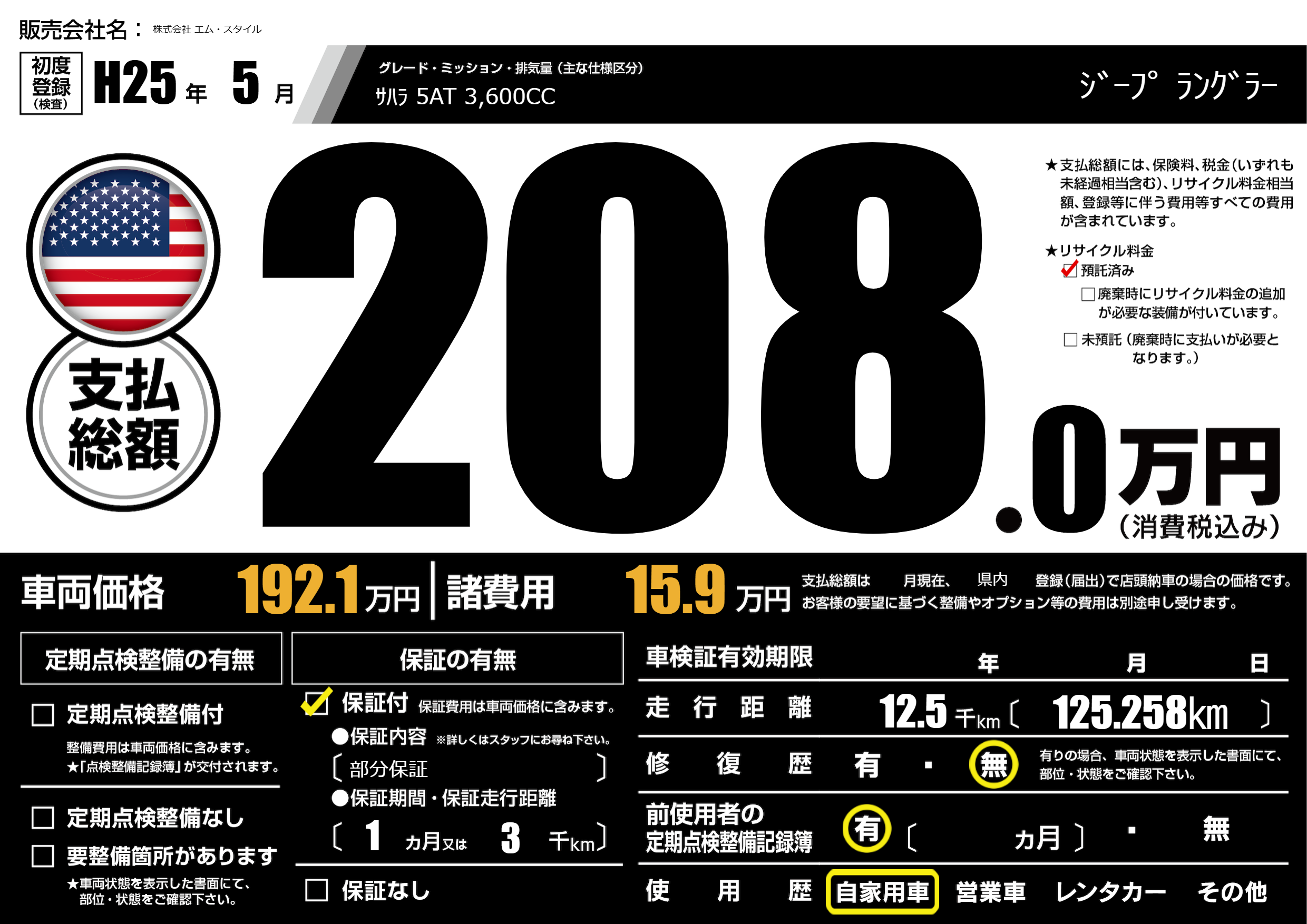 保証付き 保証内容(部分保証) 1ヶ月または(3)千kmまで |