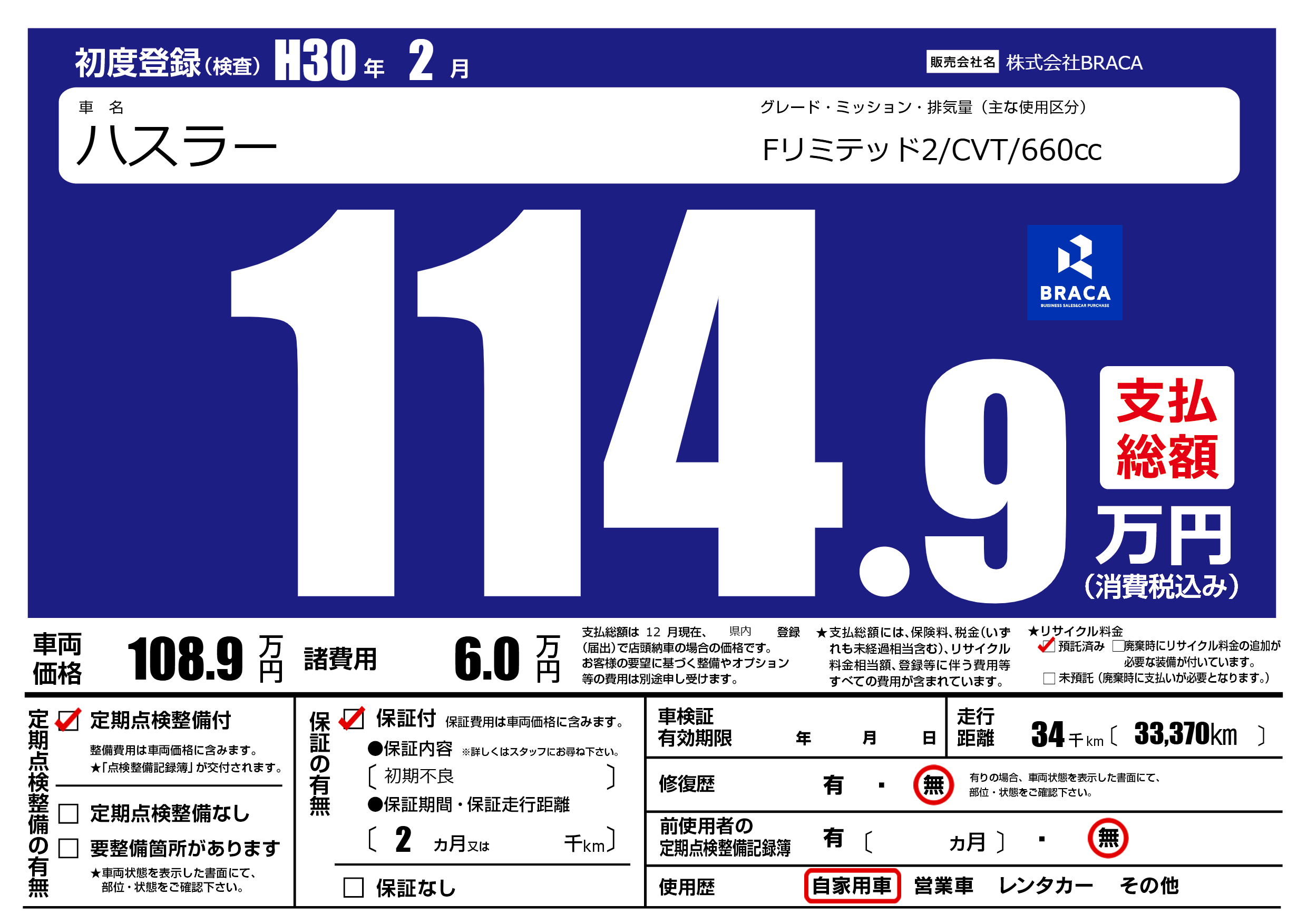 | 走行キロ | 3.4万km | 初年度登録 | H30年2月 |