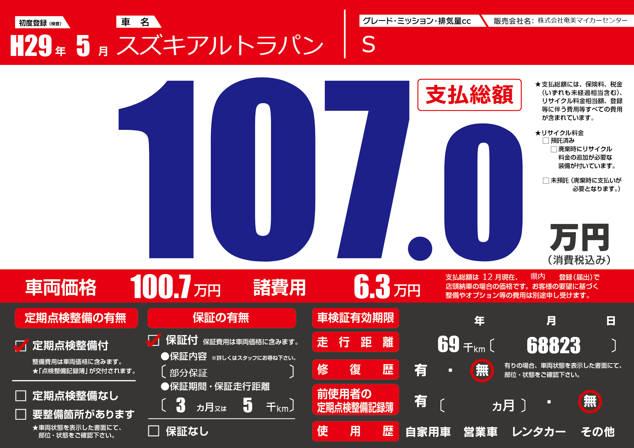 | 走行キロ | 6.9万km | 初年度登録 | H29年5月 |