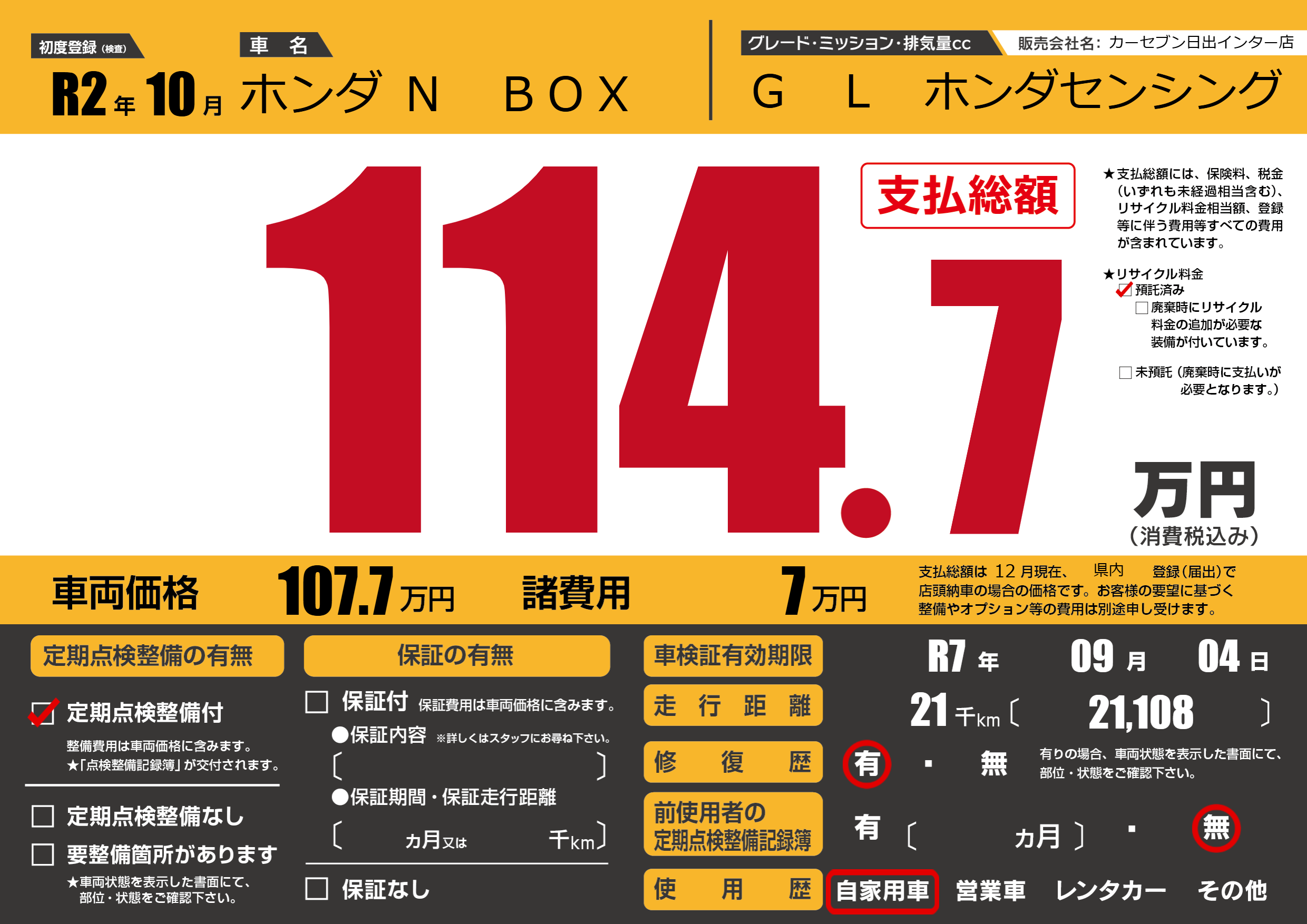 | 車名 | ホンダ N BOX | グレード ミッション 排気量 |