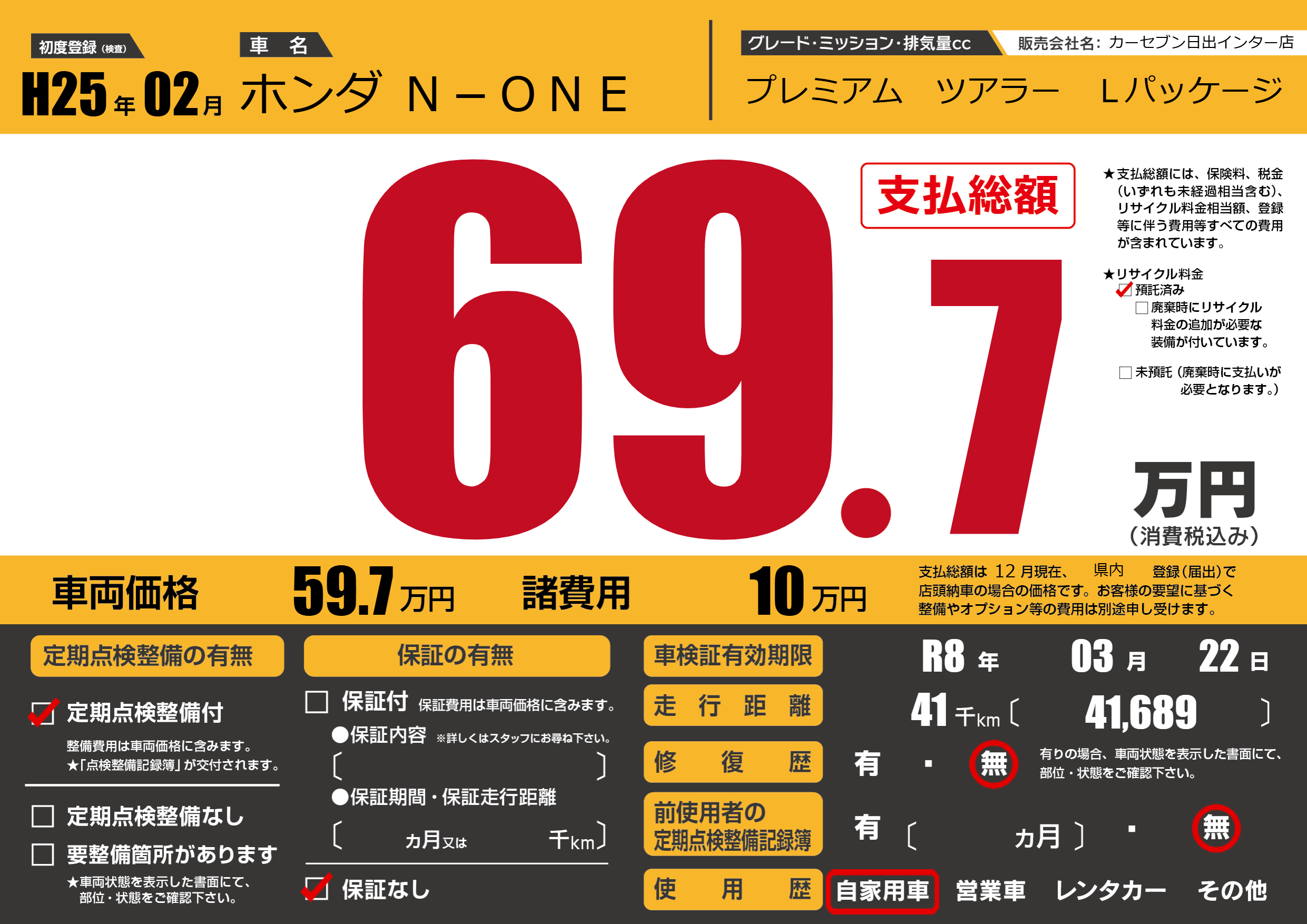 | 車名 | ホンダ N-ONE | グレード ミッション 排気量 |