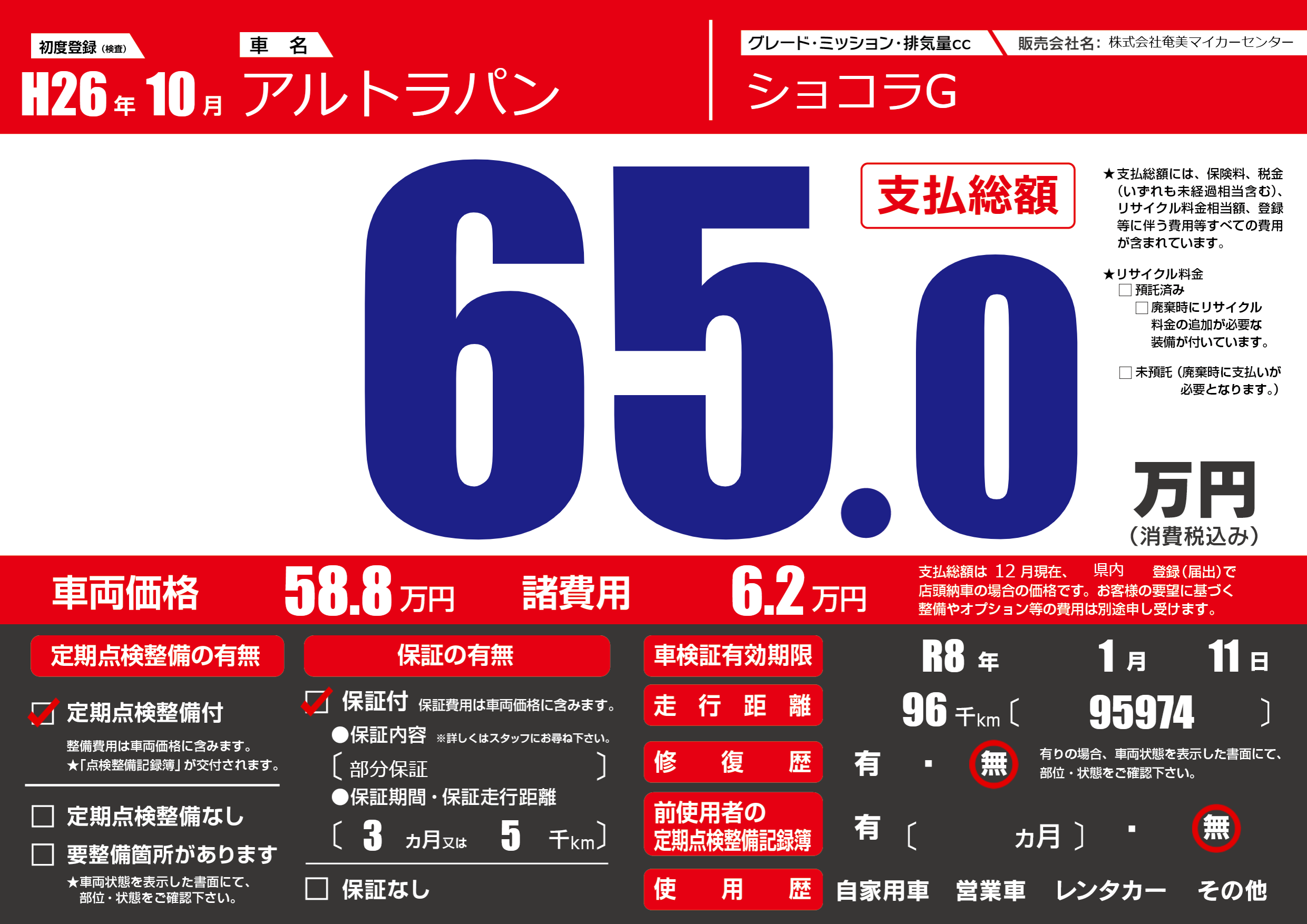 | 走行キロ | 9.6万km | 初年度登録 | H26年10月 |