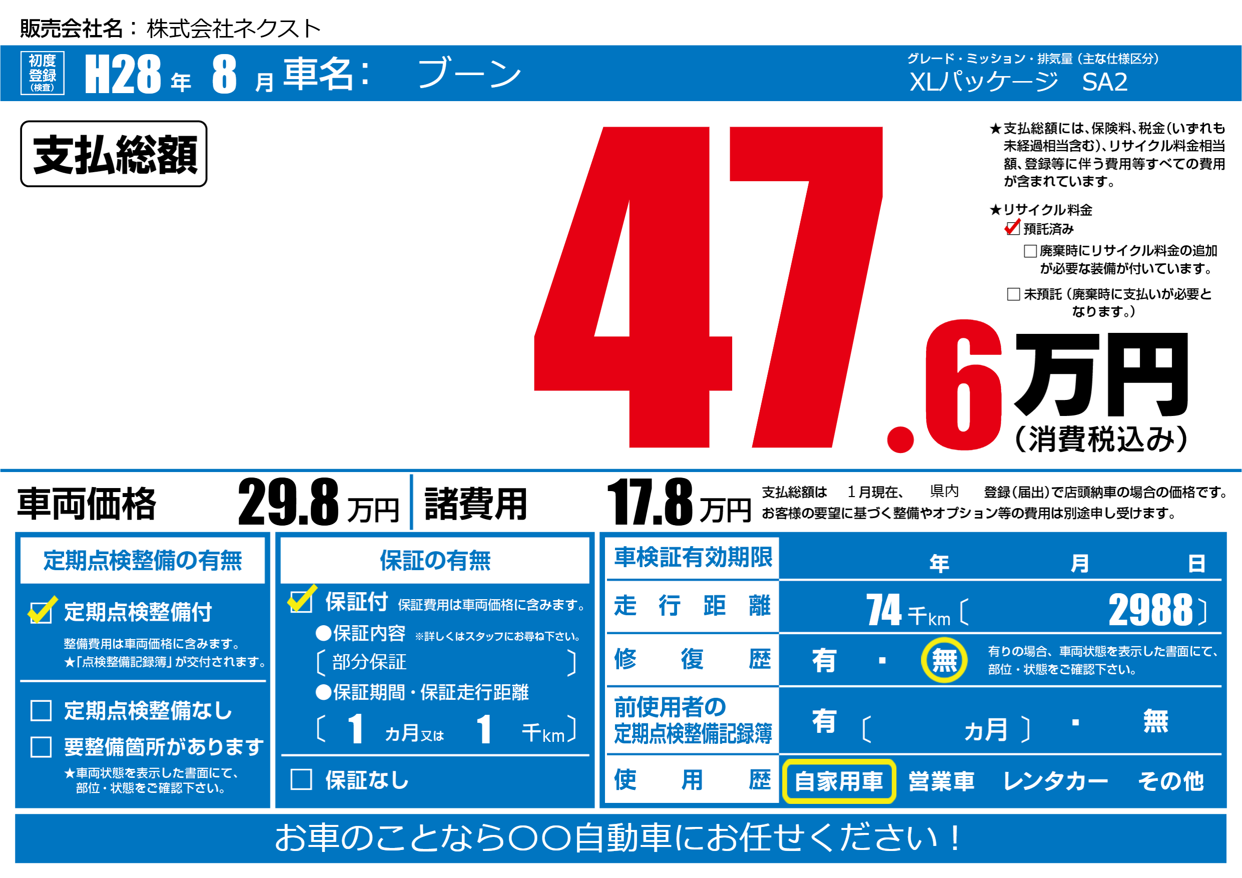 | 車名 | ブーン | グレード ミッション 排気量 |