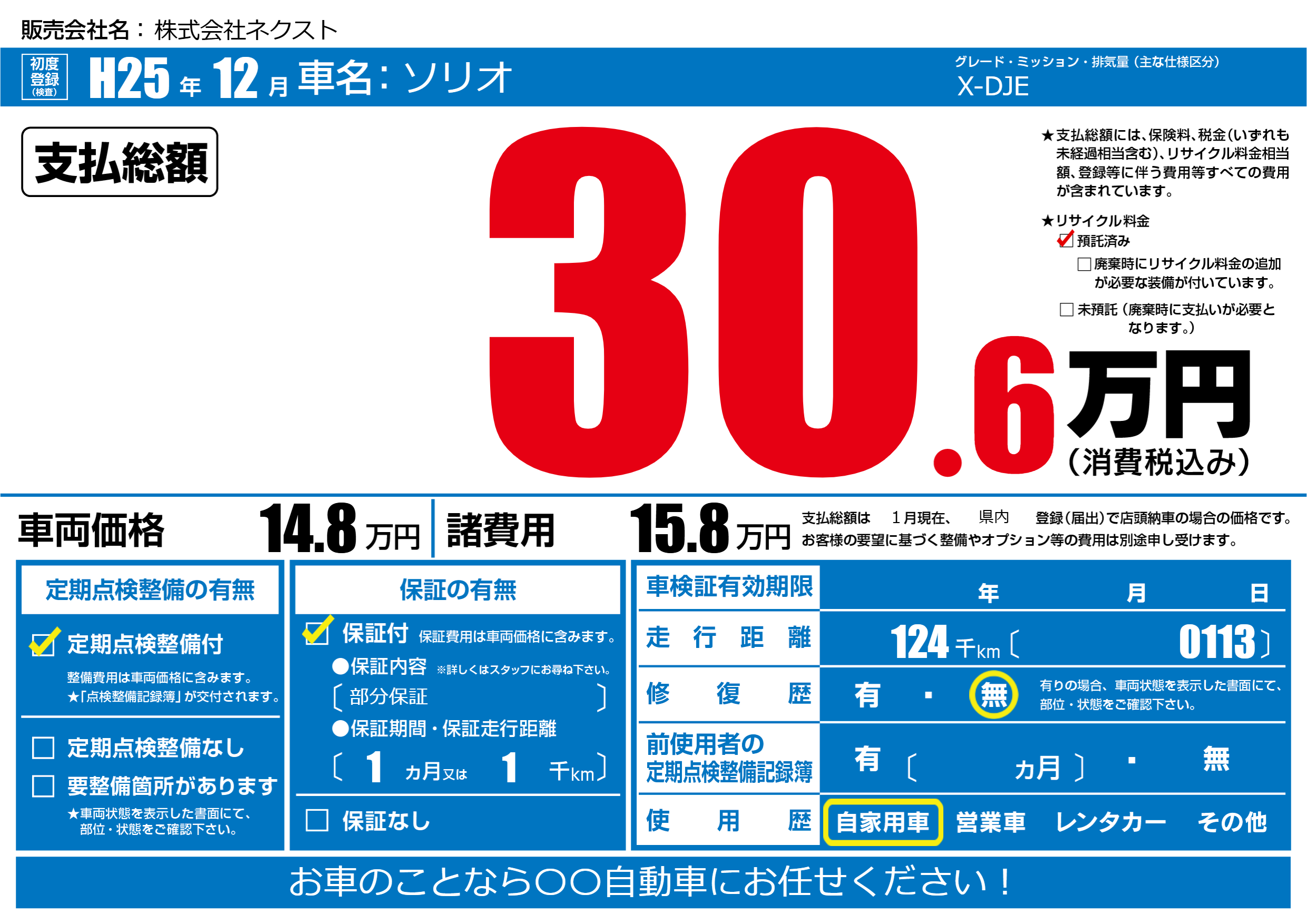 | 車名 | ソリオ | グレード ミッション 排気量 |