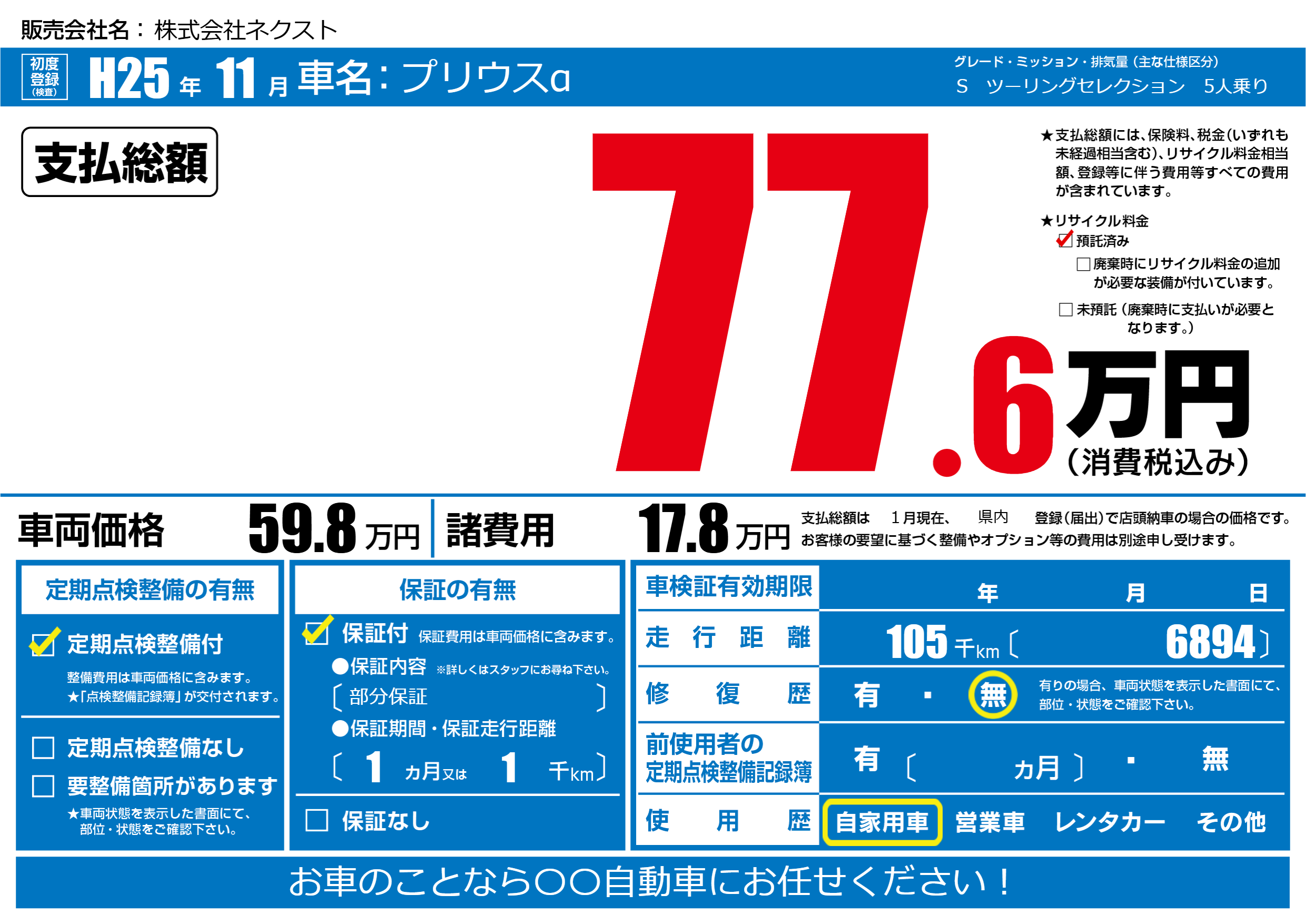 | 車名 | プリウスα | グレード ミッション 排気量 |