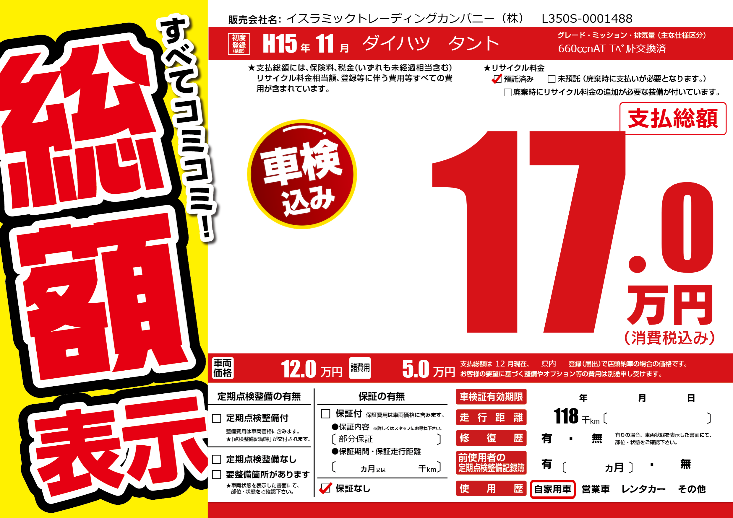 | 走行キロ | 11.8万km | 初年度登録 | H15年11月 |