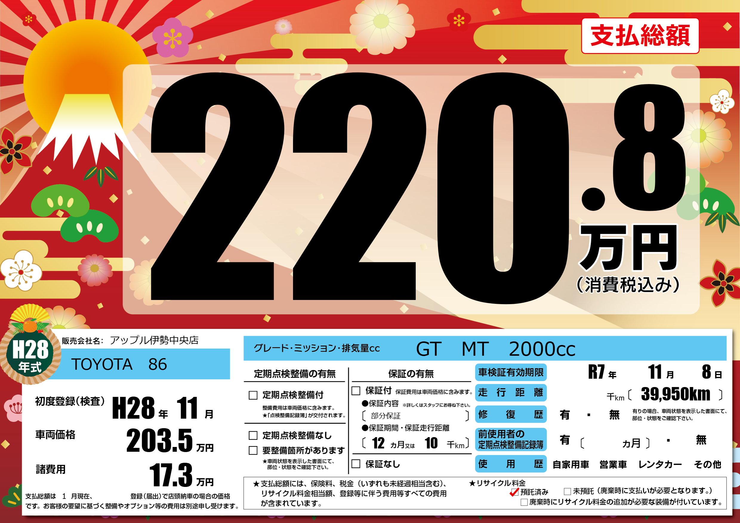 | 車名 | TOYOTA 86 | グレード ミッション 排気量 |