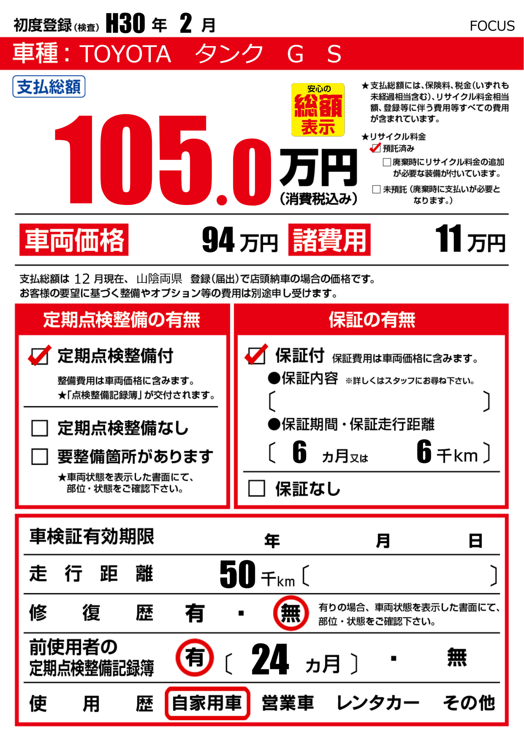 | 車名 | TOYOTA タンク G S | グレード ミッション 排気量 |