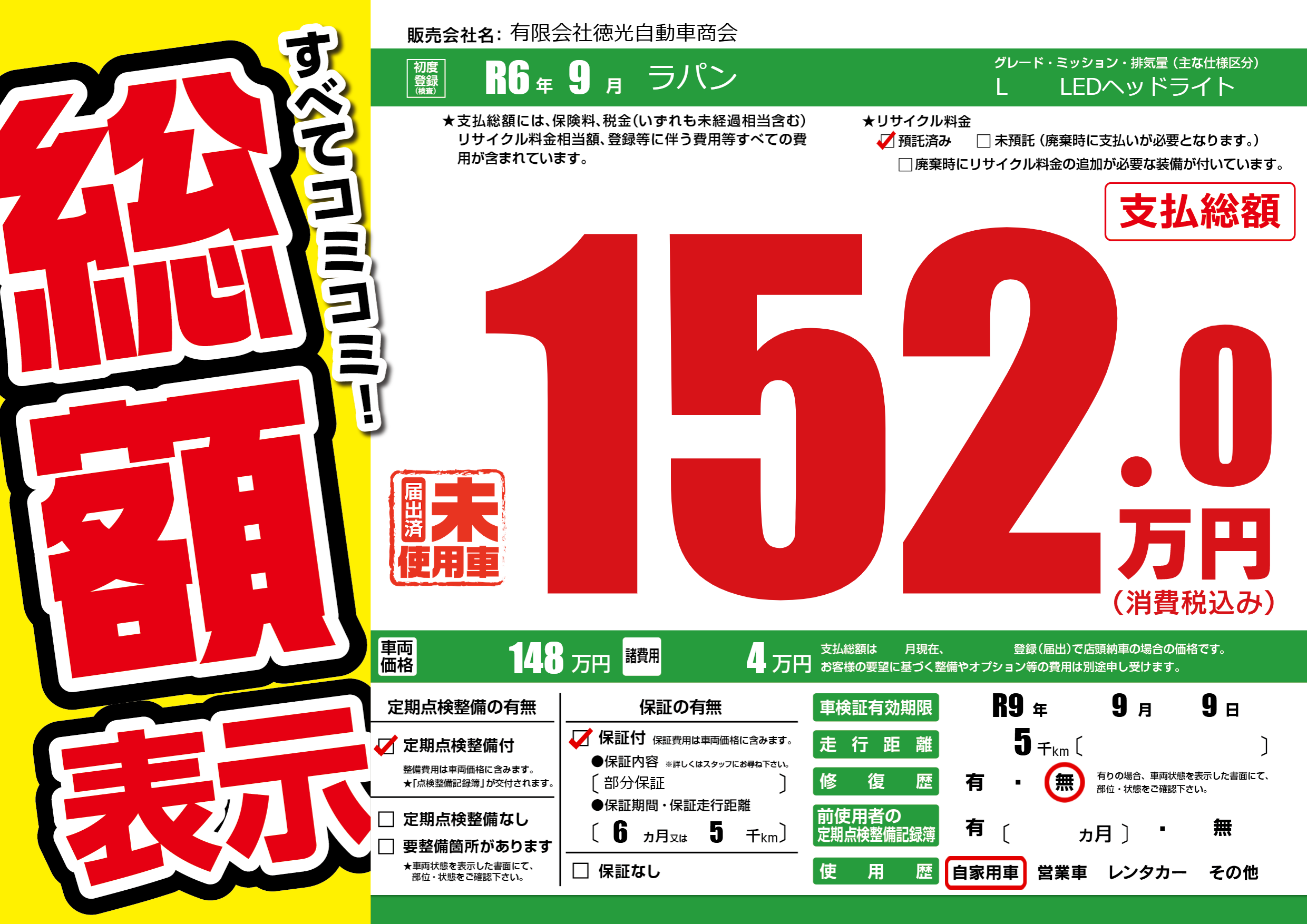 | 走行キロ | 0.5万km | 初年度登録 | R6年9月 |