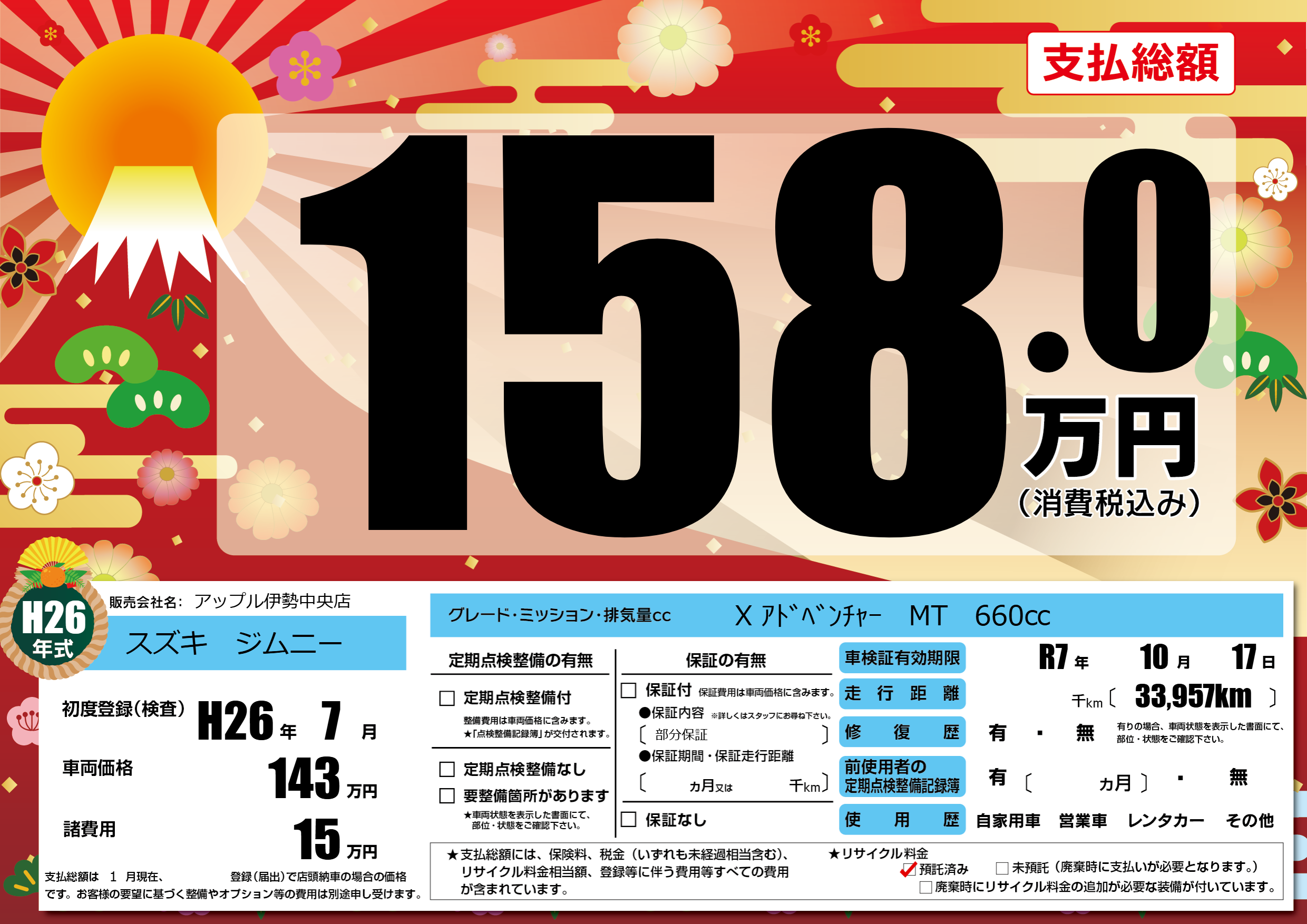 | 車名 | スズキ ジムニー | グレード ミッション 排気量 |