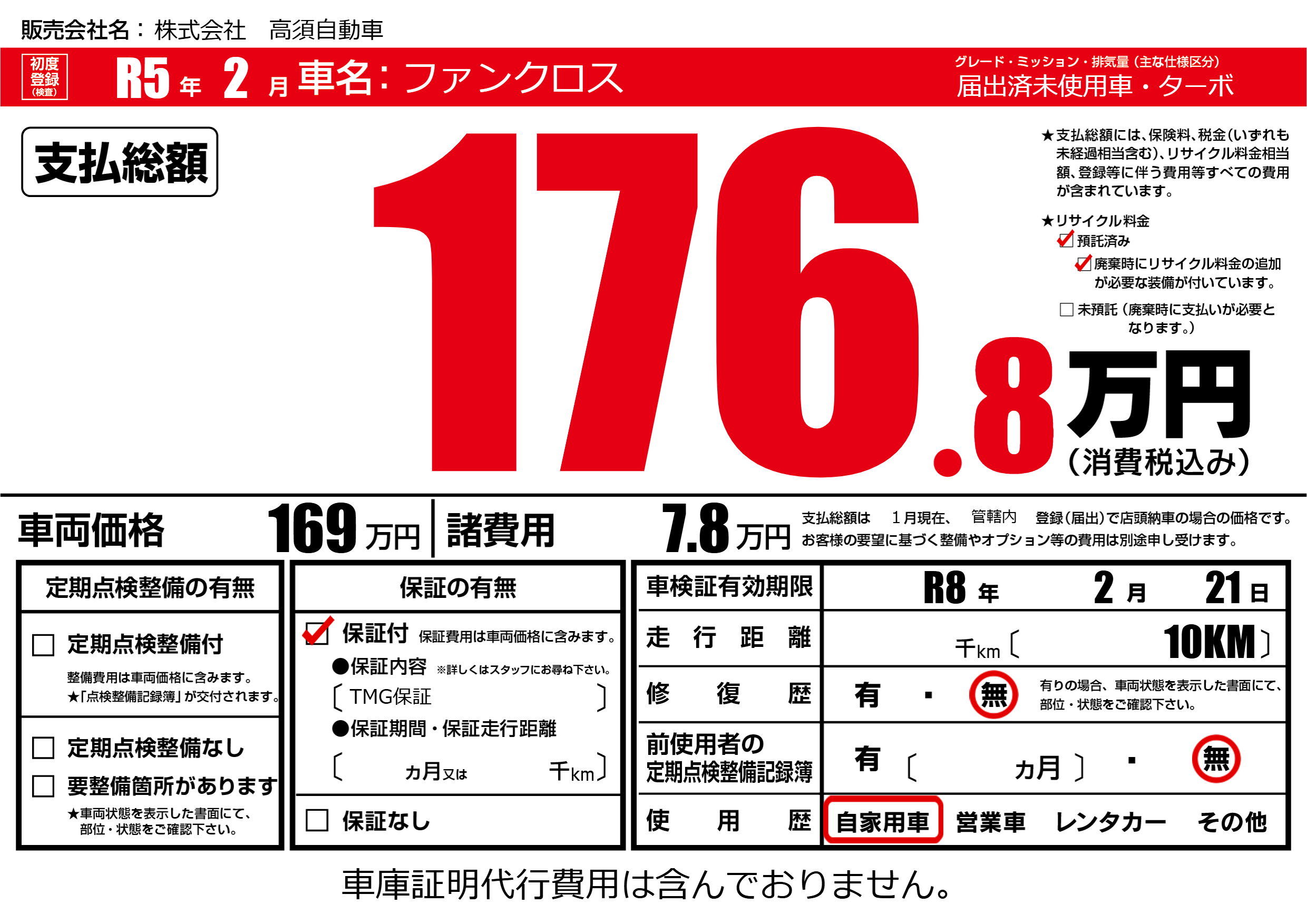 保証付き 保証内容(TMG保証) ---ヶ月または()千kmまで |